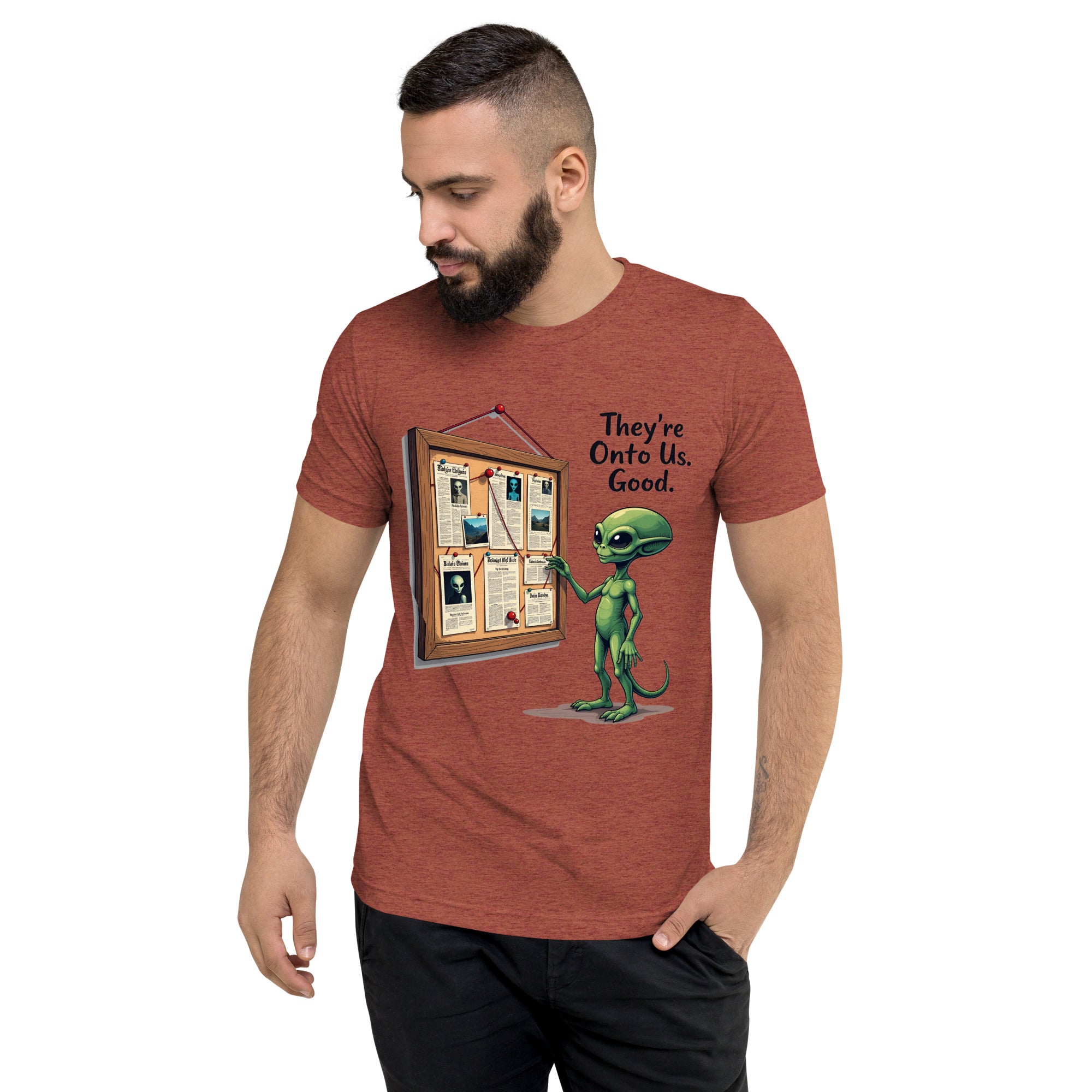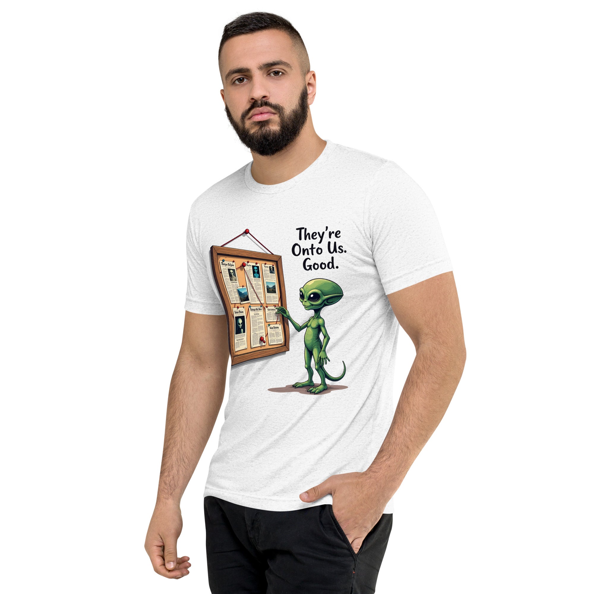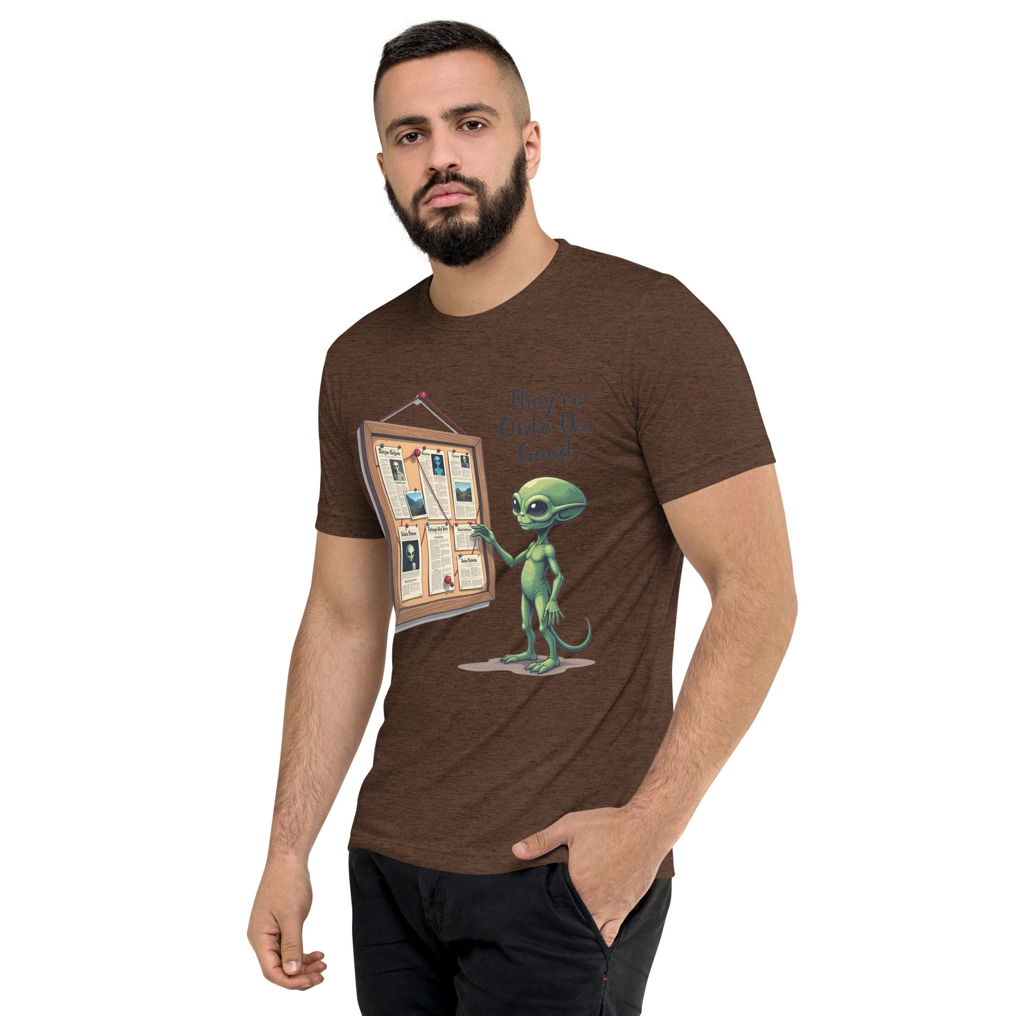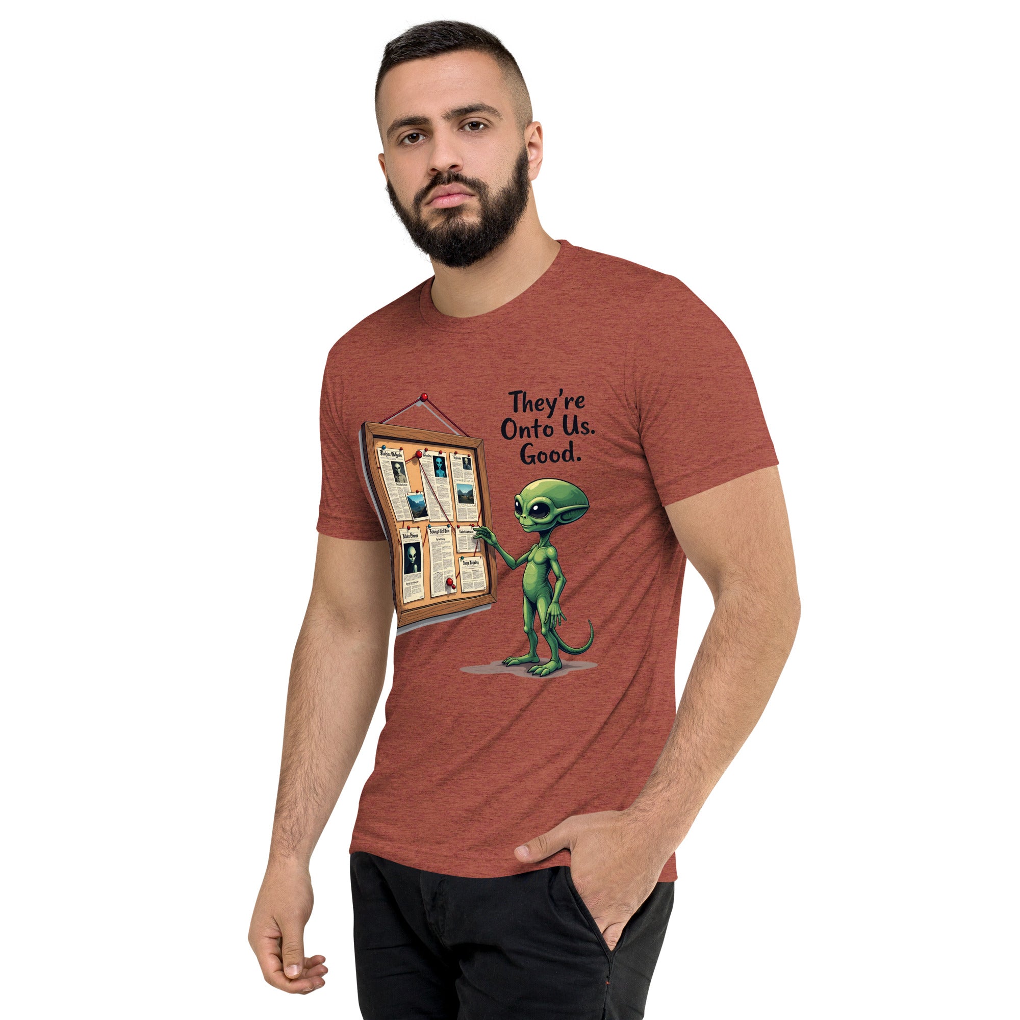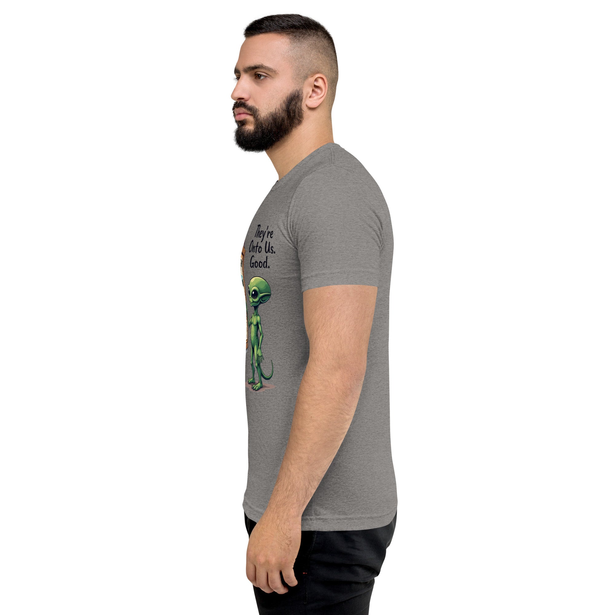 You’ve been caught. The "THEY'RE ONTO US" men’s short sleeve t-shirt is for those who know that keeping things under wraps is an art, and sometimes, the world just starts to catch on. Whether you're dealing with sneaky coworkers, curious strangers, or just the feeling that people are watching you a little too closely, this shirt has the perfect message: it’s only a matter of time before they figure you out.
