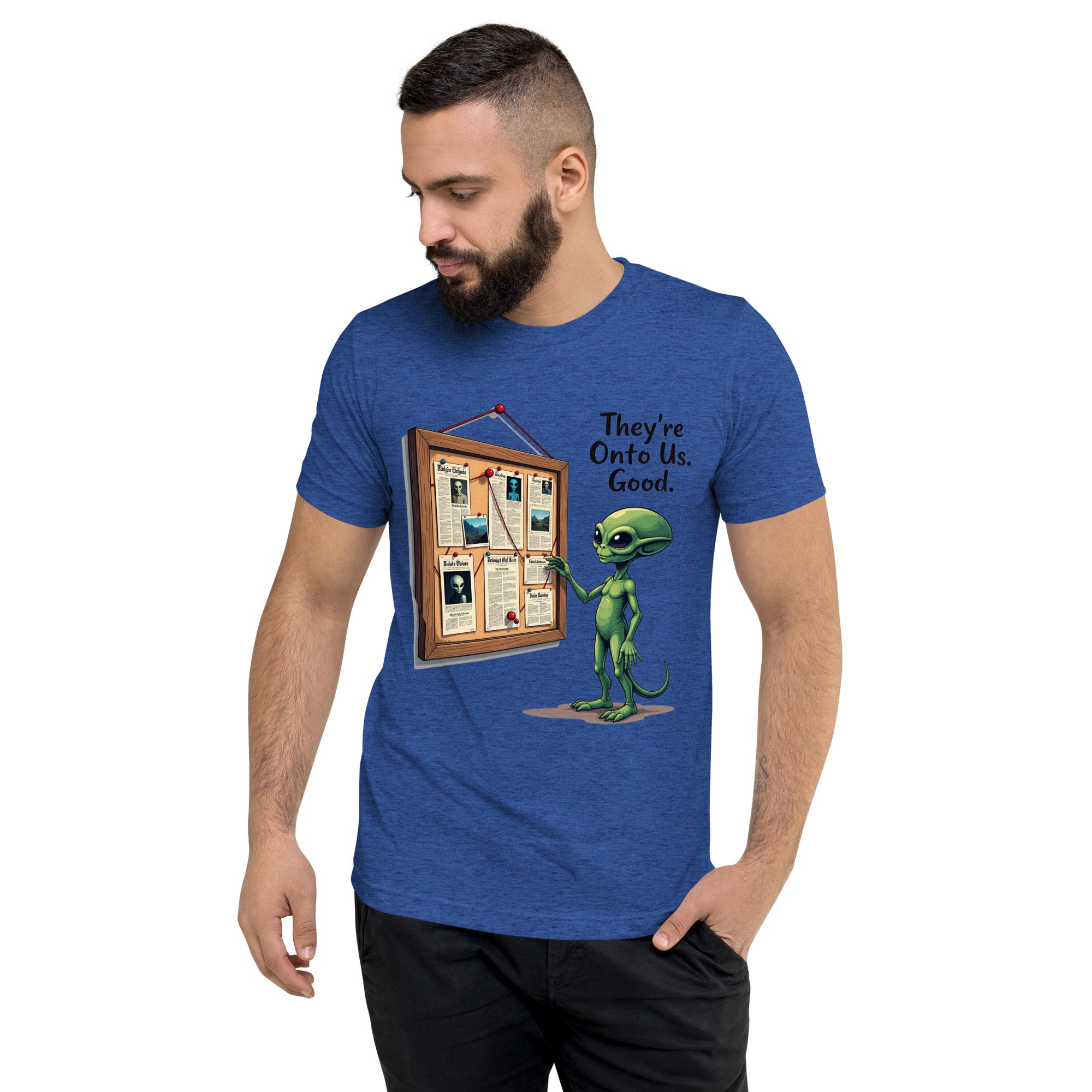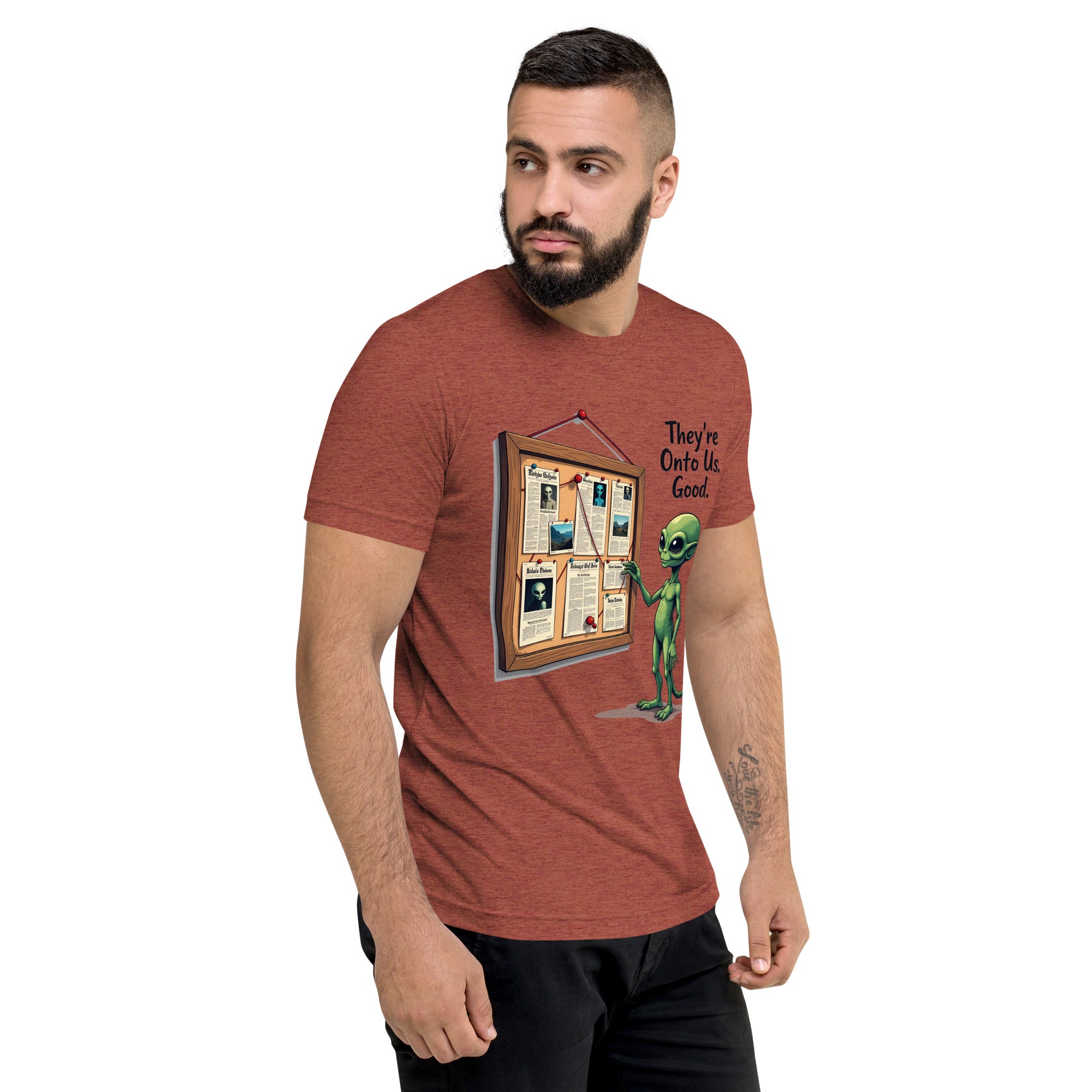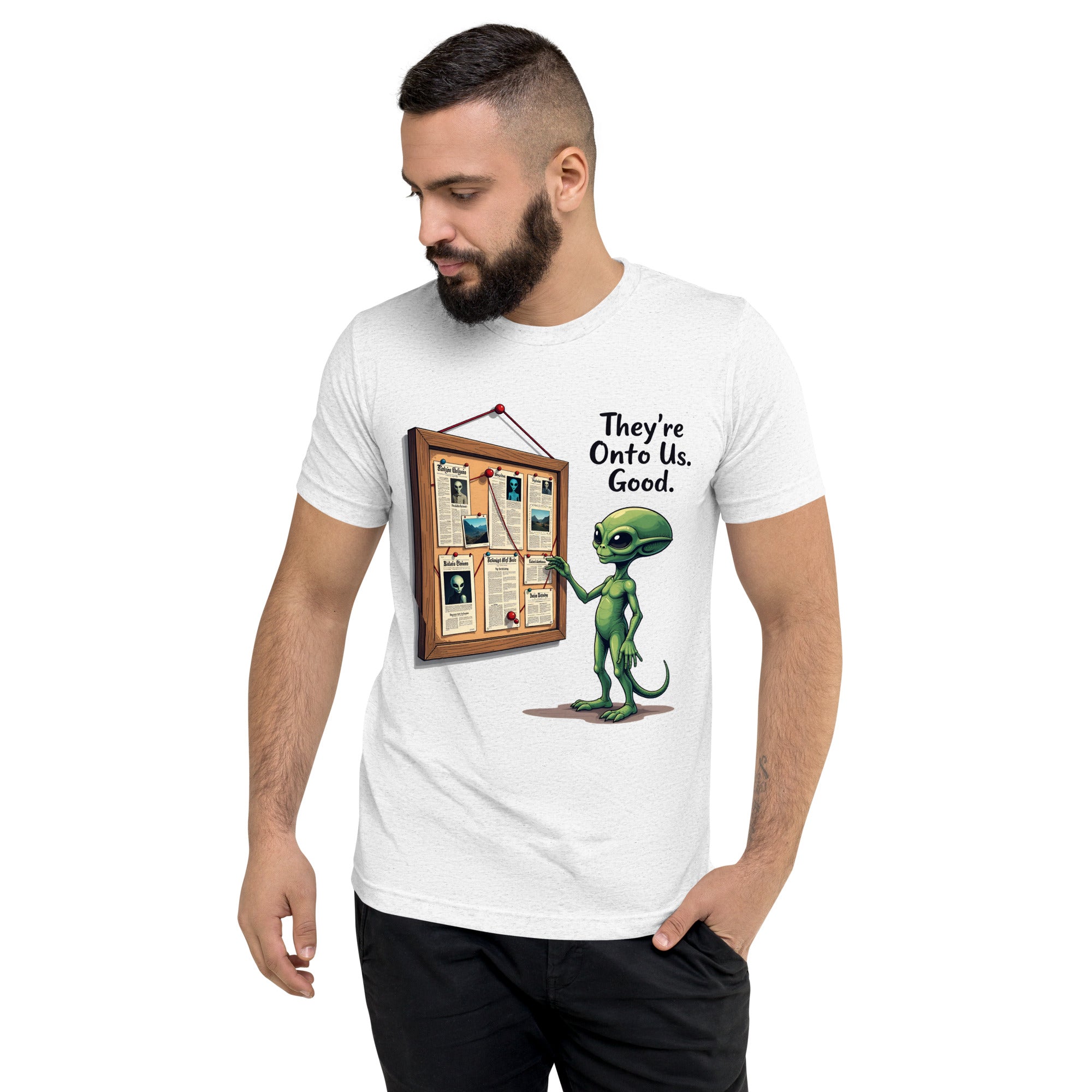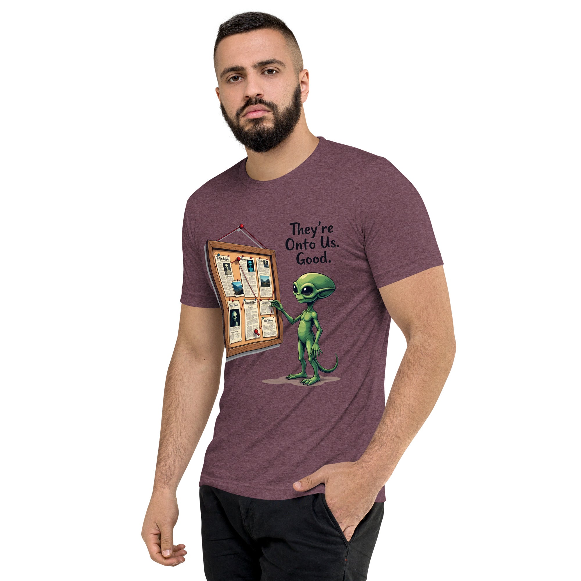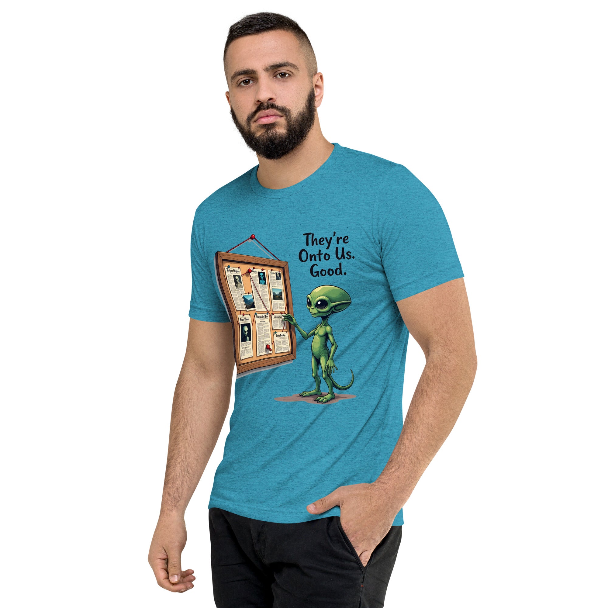 You’ve been caught. The "THEY'RE ONTO US" men’s short sleeve t-shirt is for those who know that keeping things under wraps is an art, and sometimes, the world just starts to catch on. Whether you're dealing with sneaky coworkers, curious strangers, or just the feeling that people are watching you a little too closely, this shirt has the perfect message: it’s only a matter of time before they figure you out.