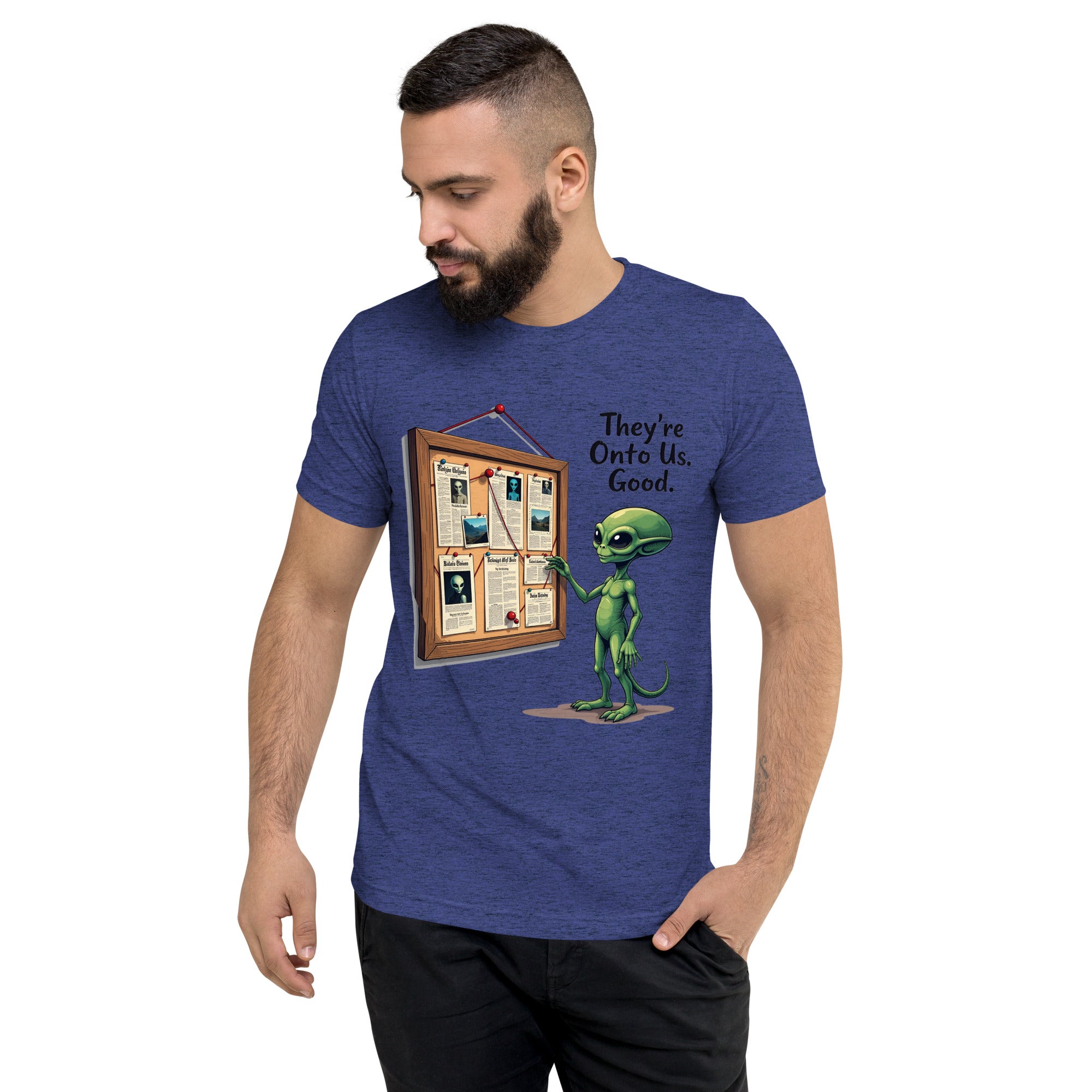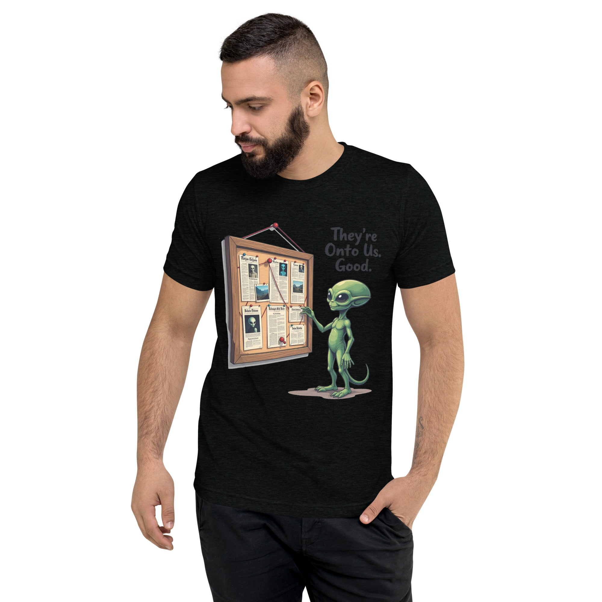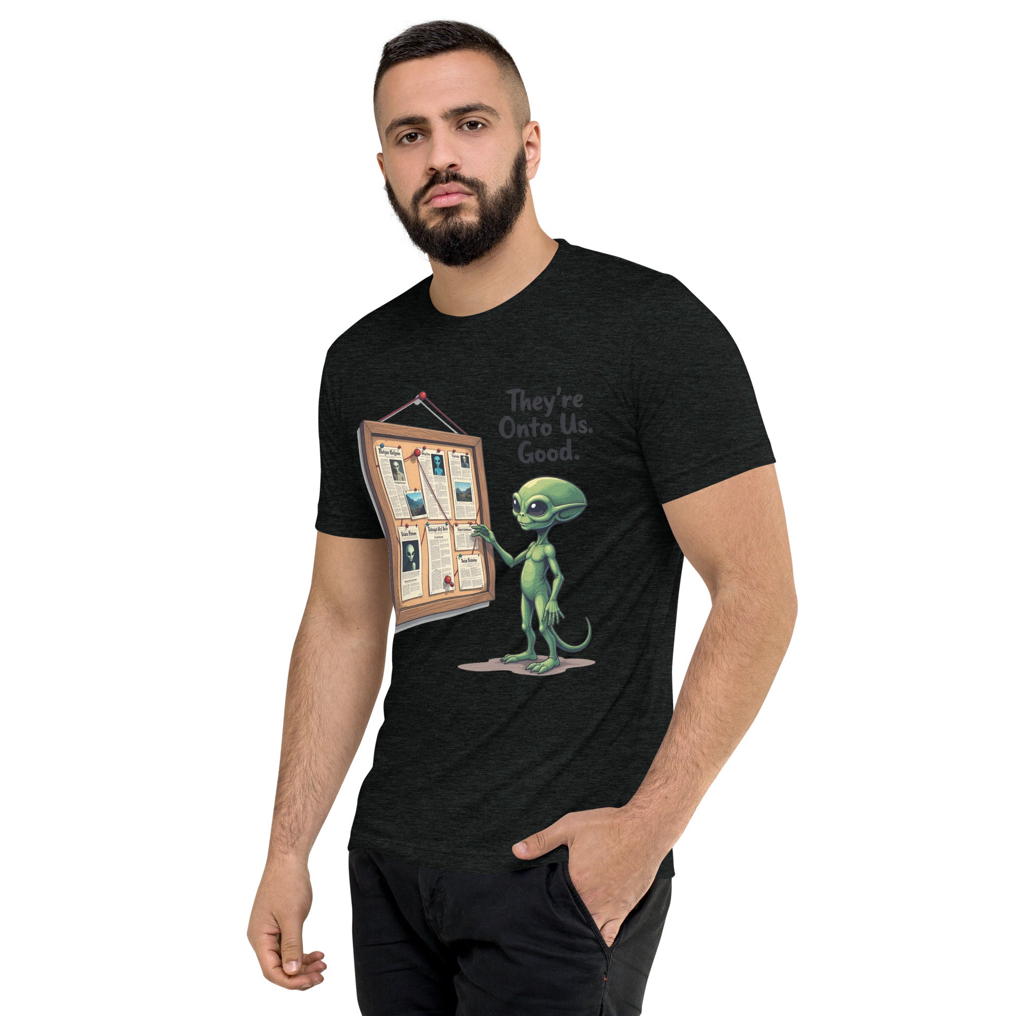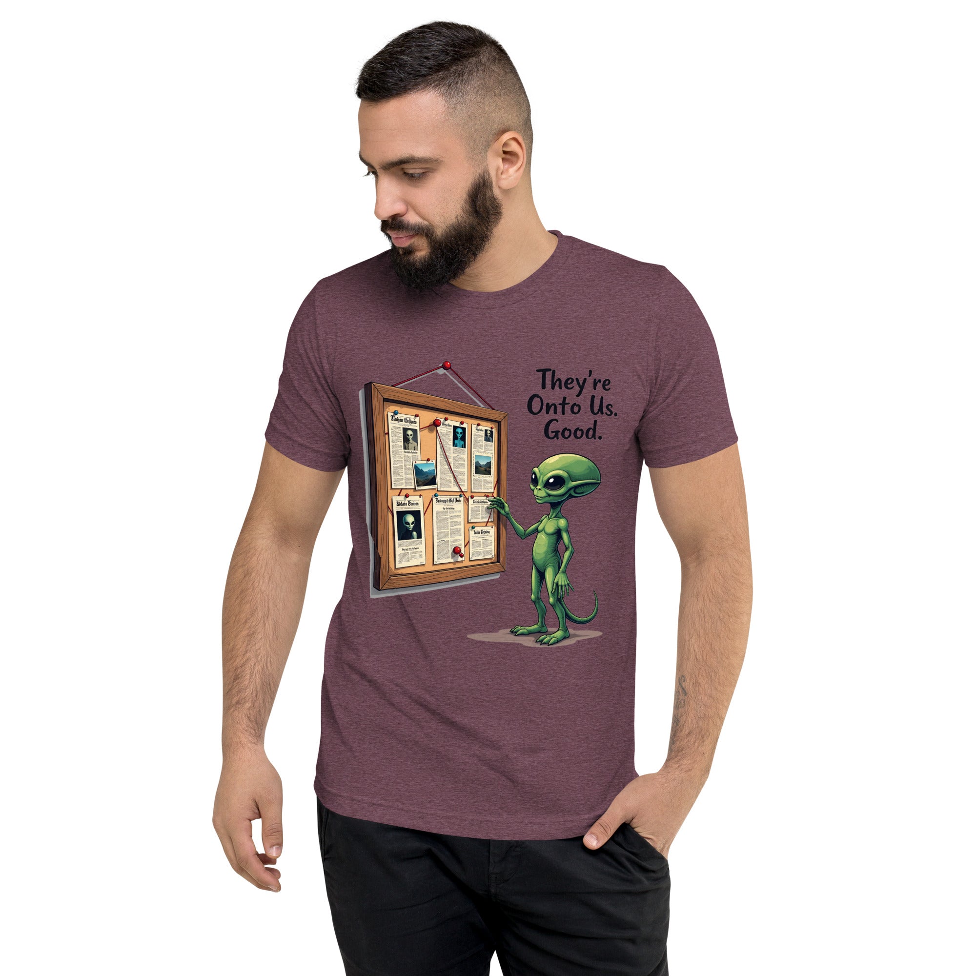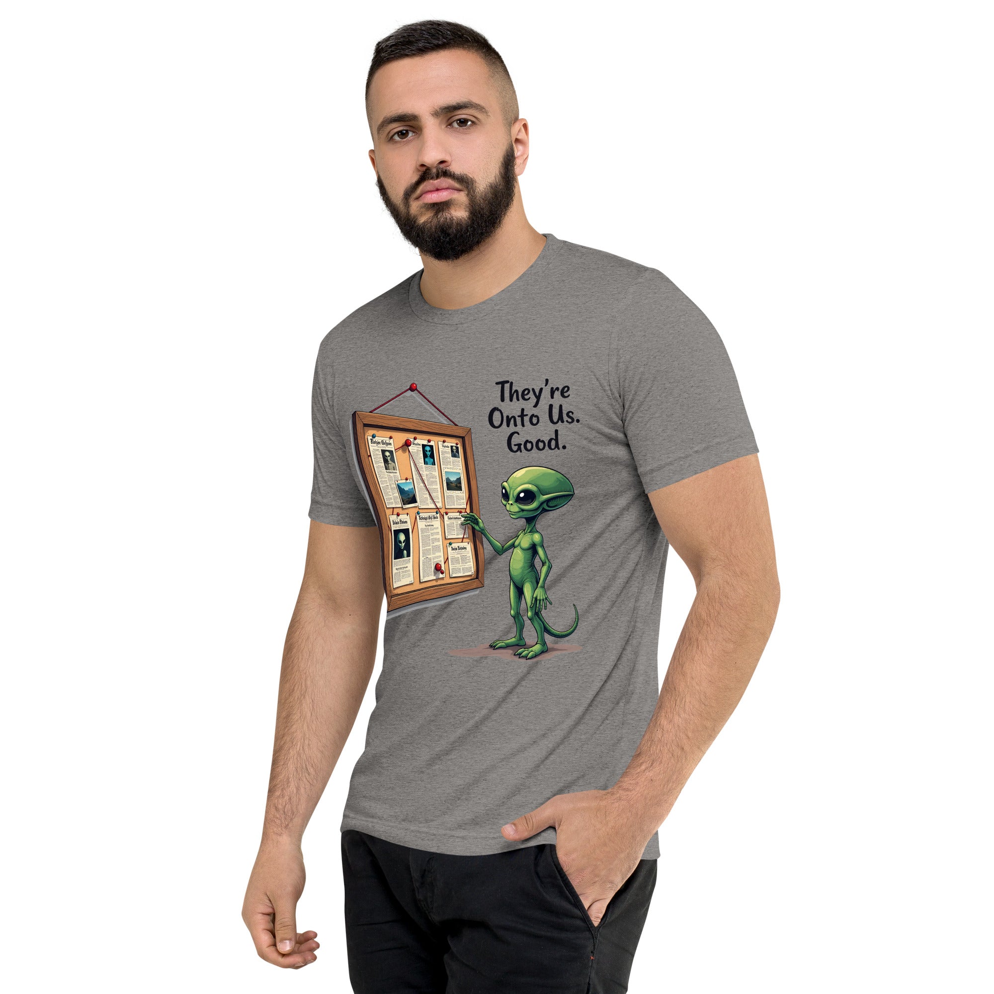 You’ve been caught. The "THEY'RE ONTO US" men’s short sleeve t-shirt is for those who know that keeping things under wraps is an art, and sometimes, the world just starts to catch on. Whether you're dealing with sneaky coworkers, curious strangers, or just the feeling that people are watching you a little too closely, this shirt has the perfect message: it’s only a matter of time before they figure you out.