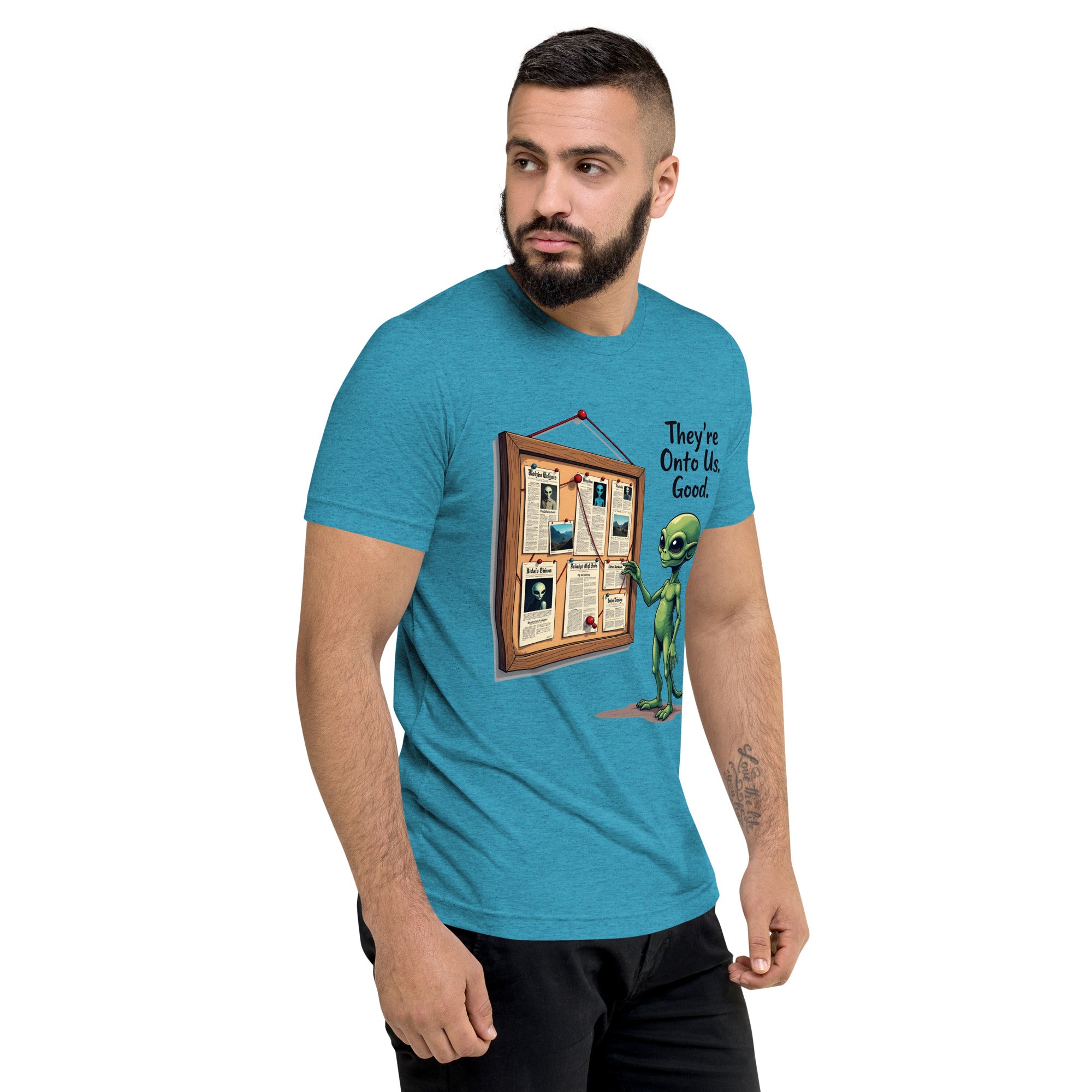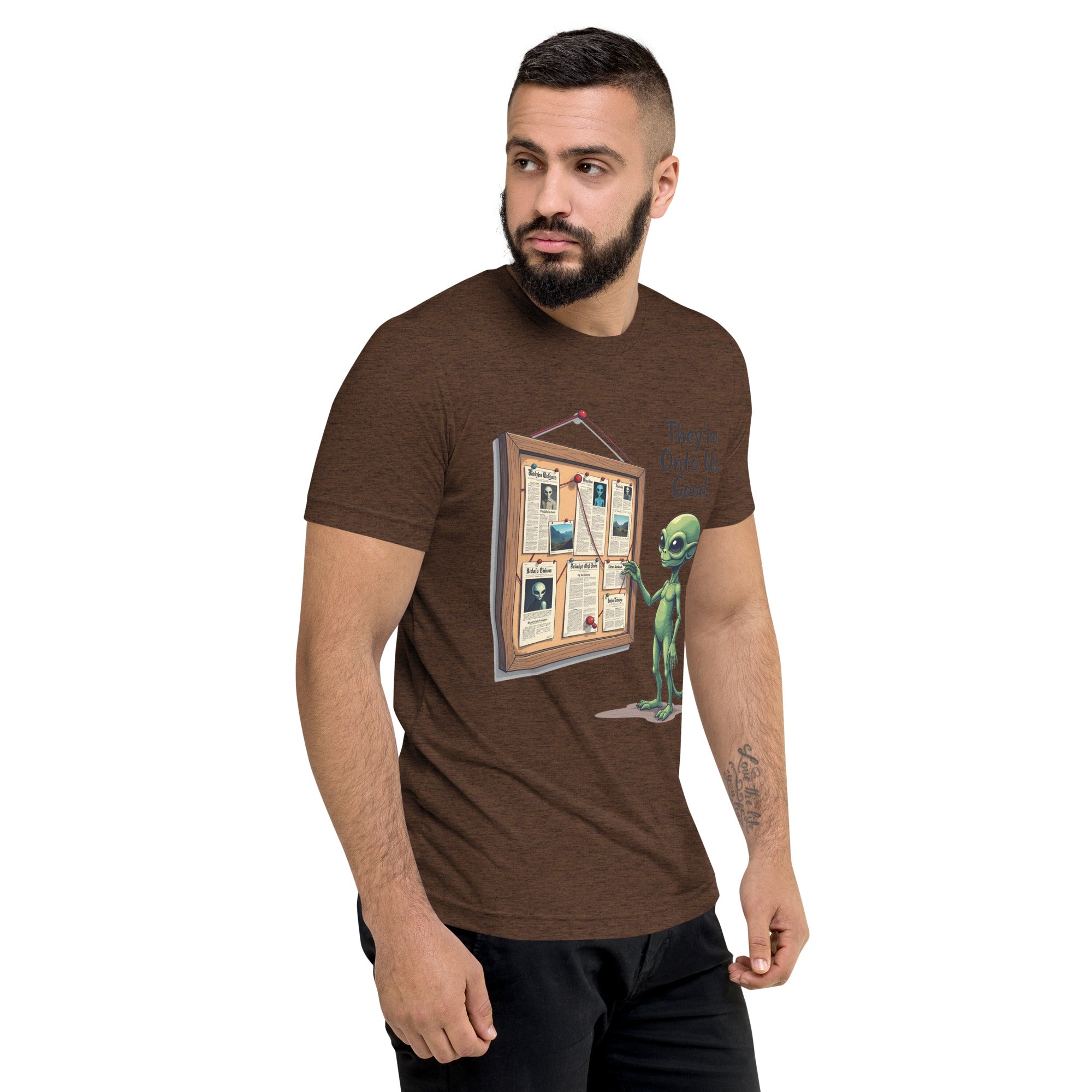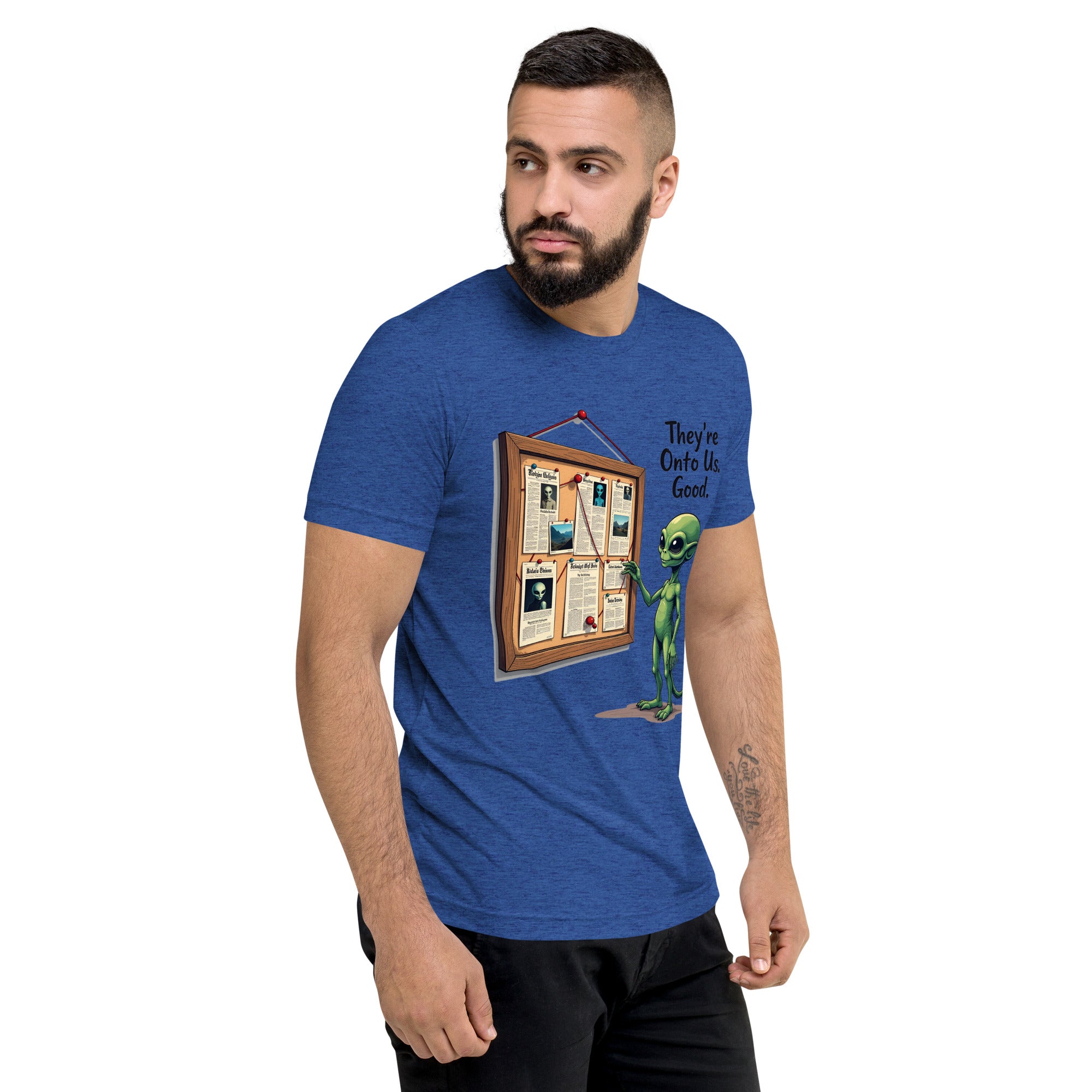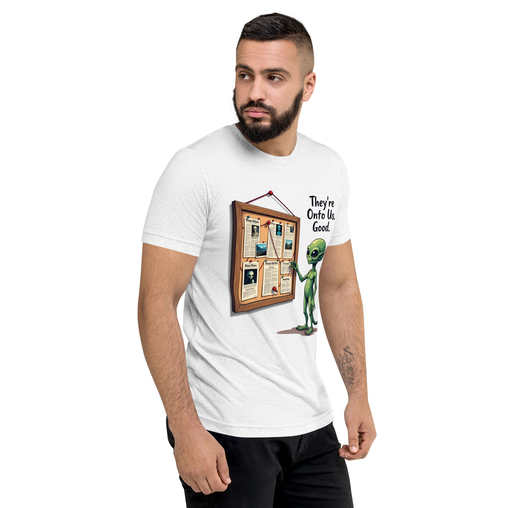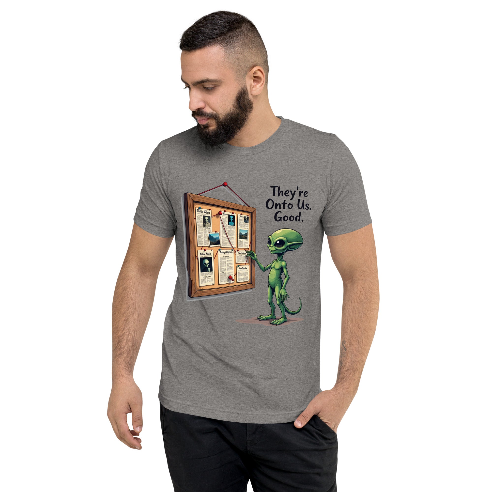 You’ve been caught. The "THEY'RE ONTO US" men’s short sleeve t-shirt is for those who know that keeping things under wraps is an art, and sometimes, the world just starts to catch on. Whether you're dealing with sneaky coworkers, curious strangers, or just the feeling that people are watching you a little too closely, this shirt has the perfect message: it’s only a matter of time before they figure you out.
