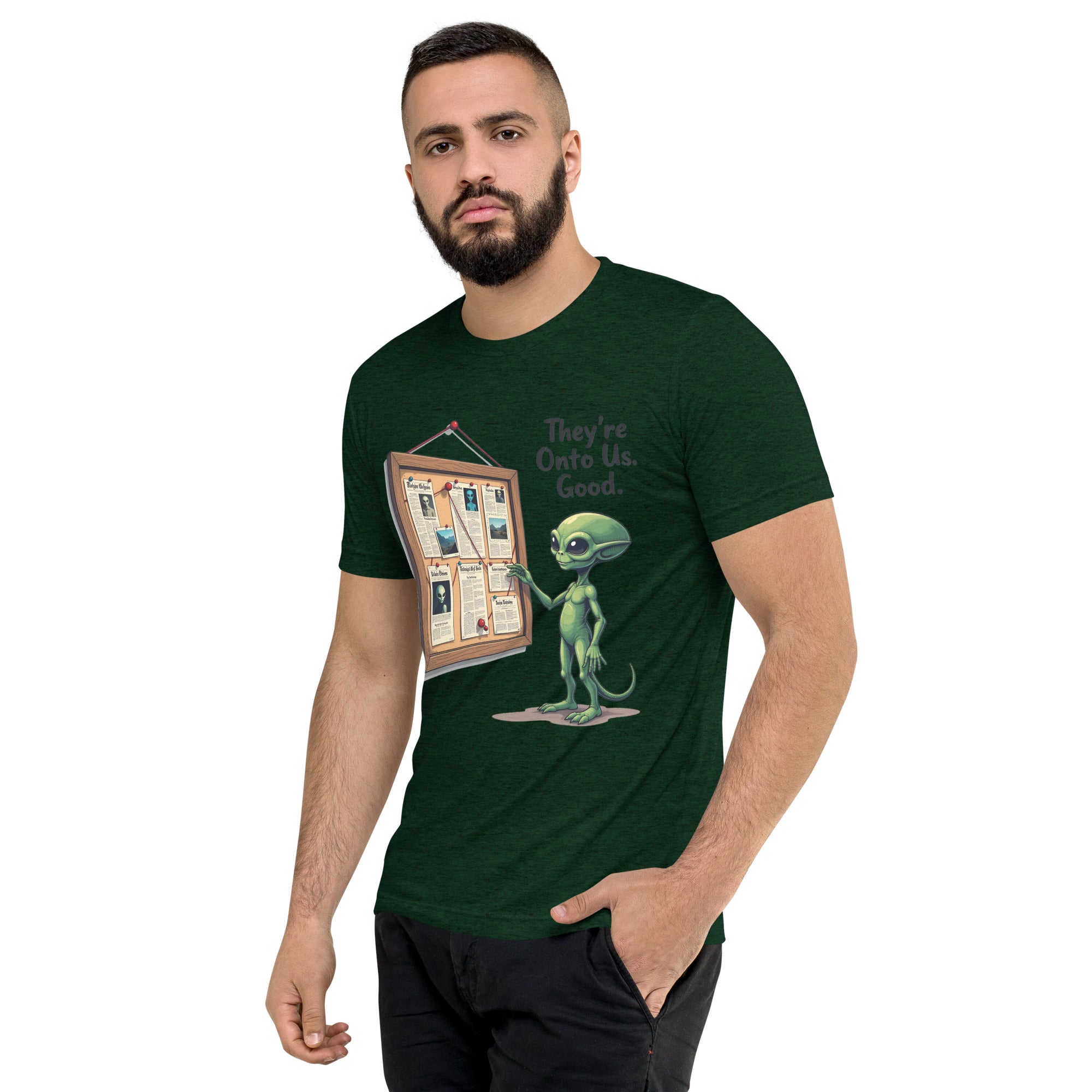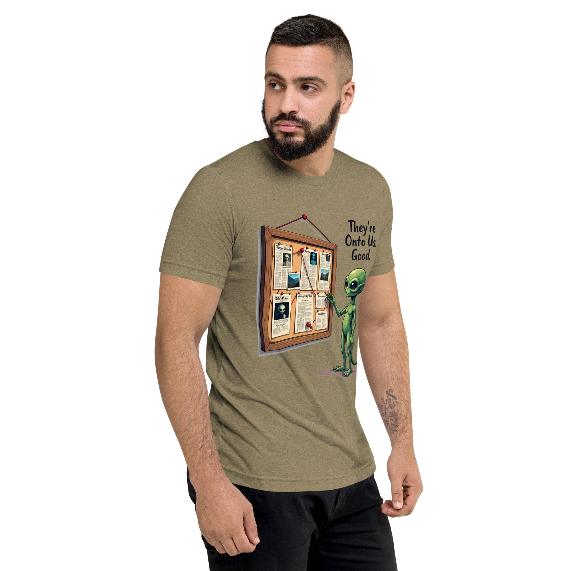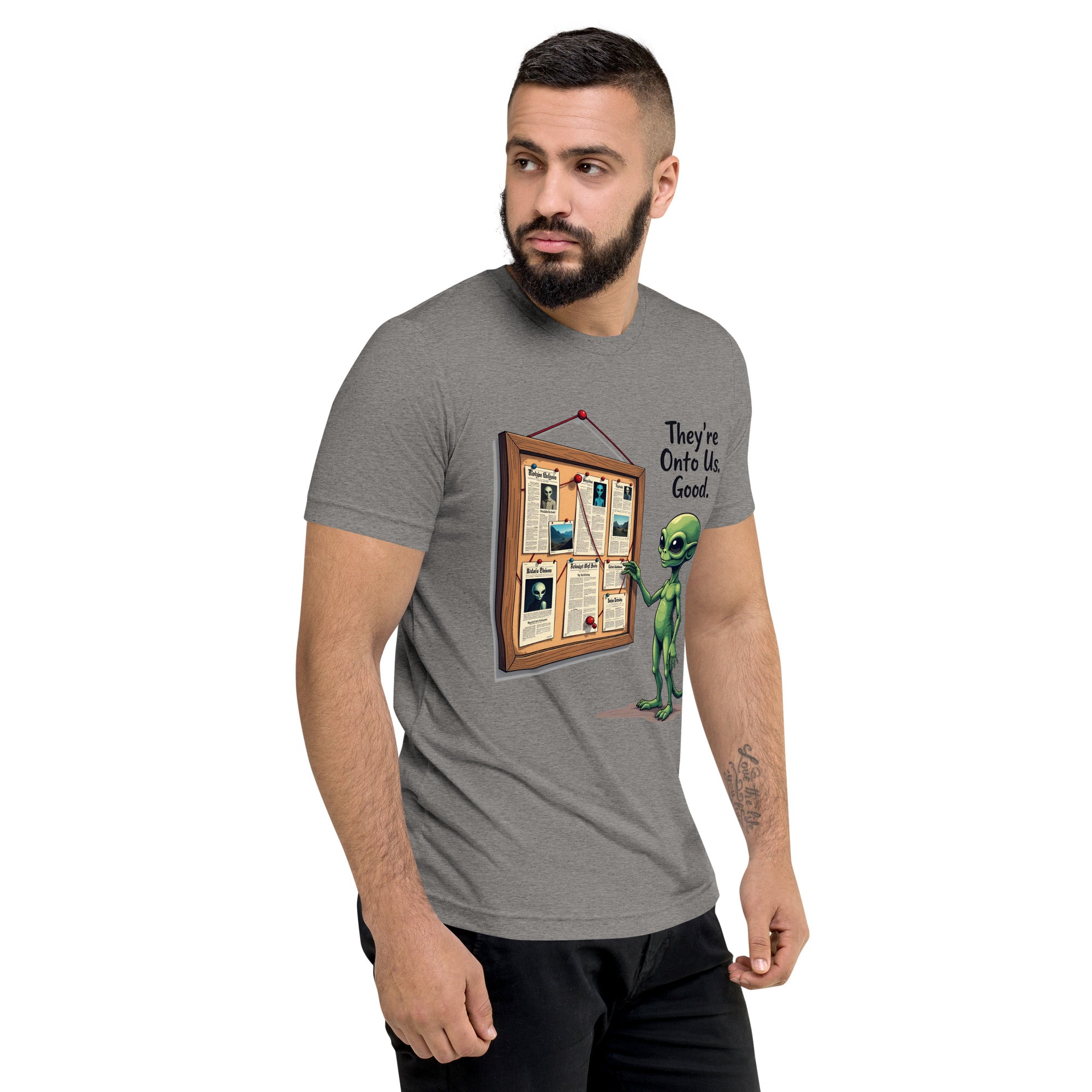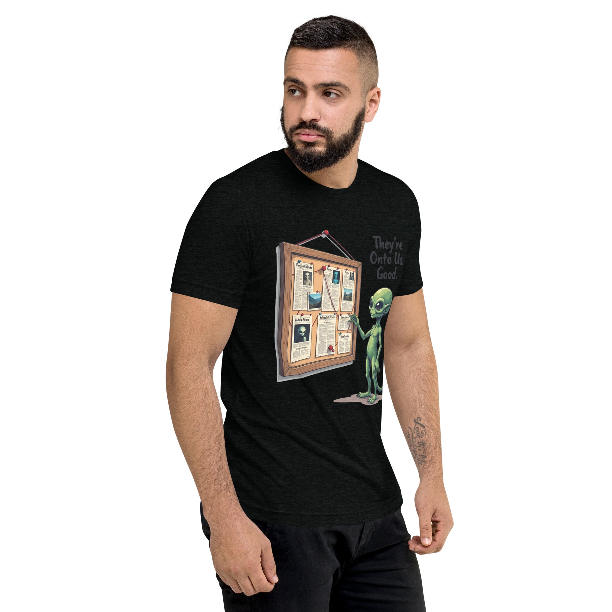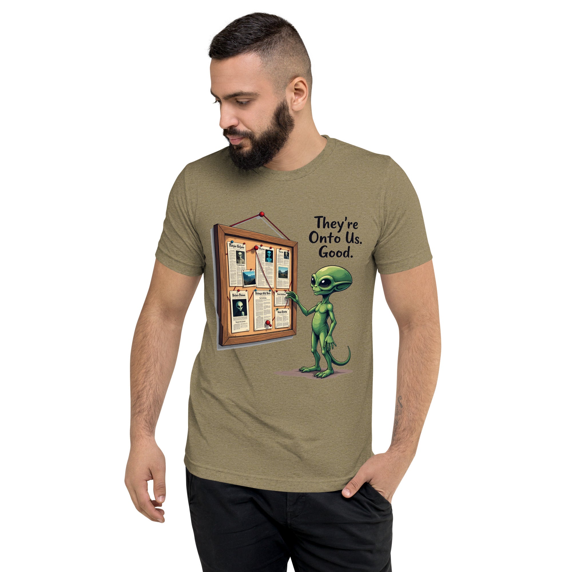 You’ve been caught. The "THEY'RE ONTO US" men’s short sleeve t-shirt is for those who know that keeping things under wraps is an art, and sometimes, the world just starts to catch on. Whether you're dealing with sneaky coworkers, curious strangers, or just the feeling that people are watching you a little too closely, this shirt has the perfect message: it’s only a matter of time before they figure you out.