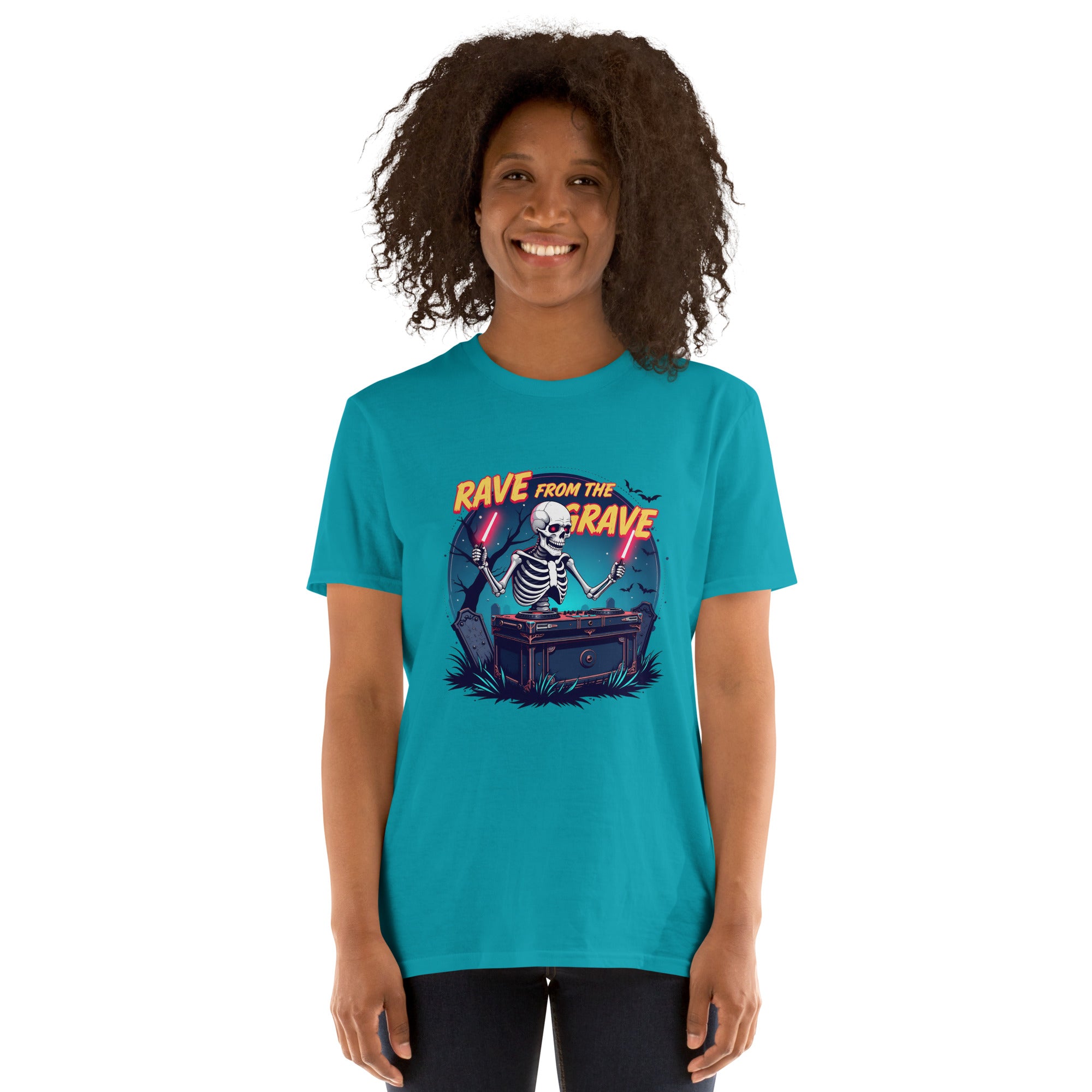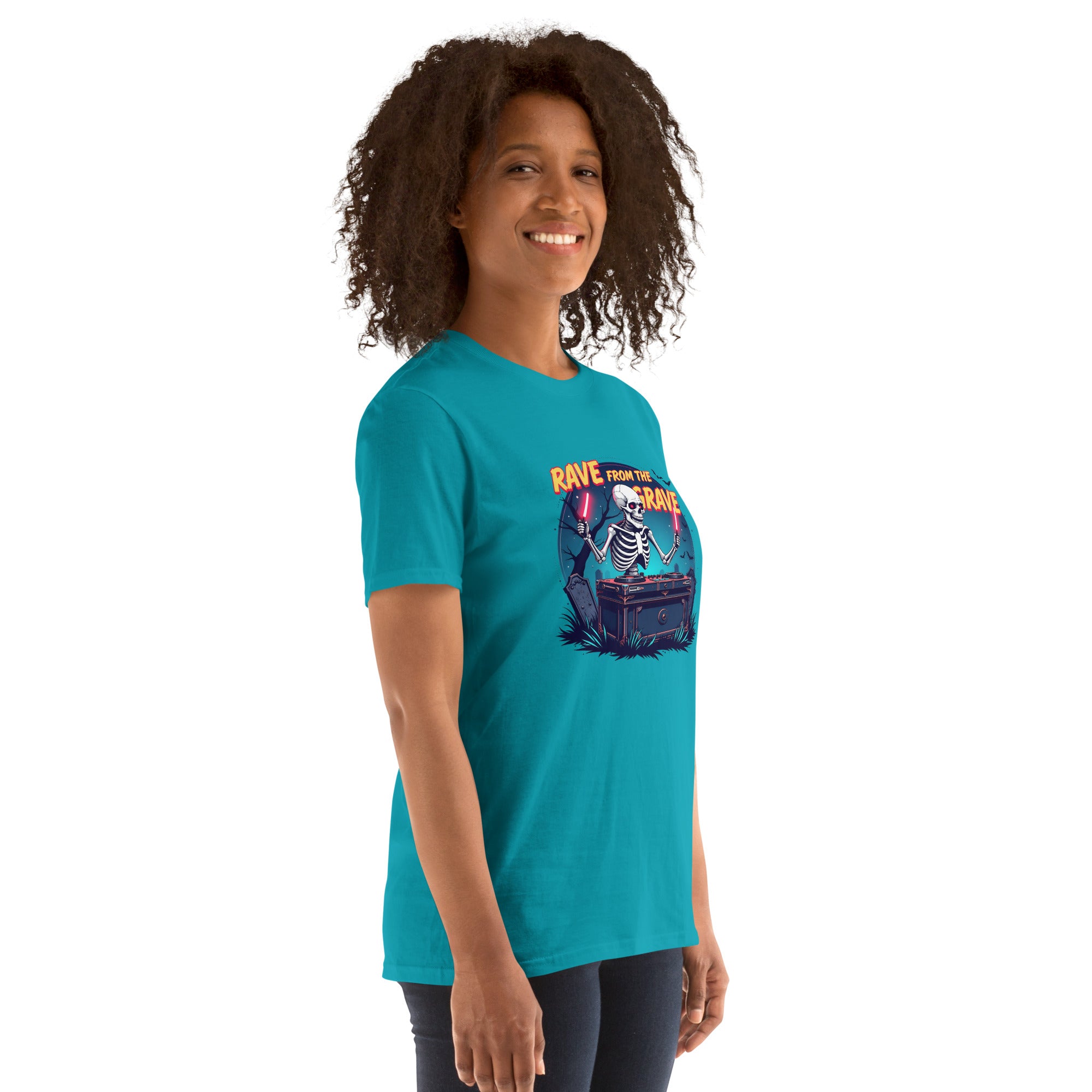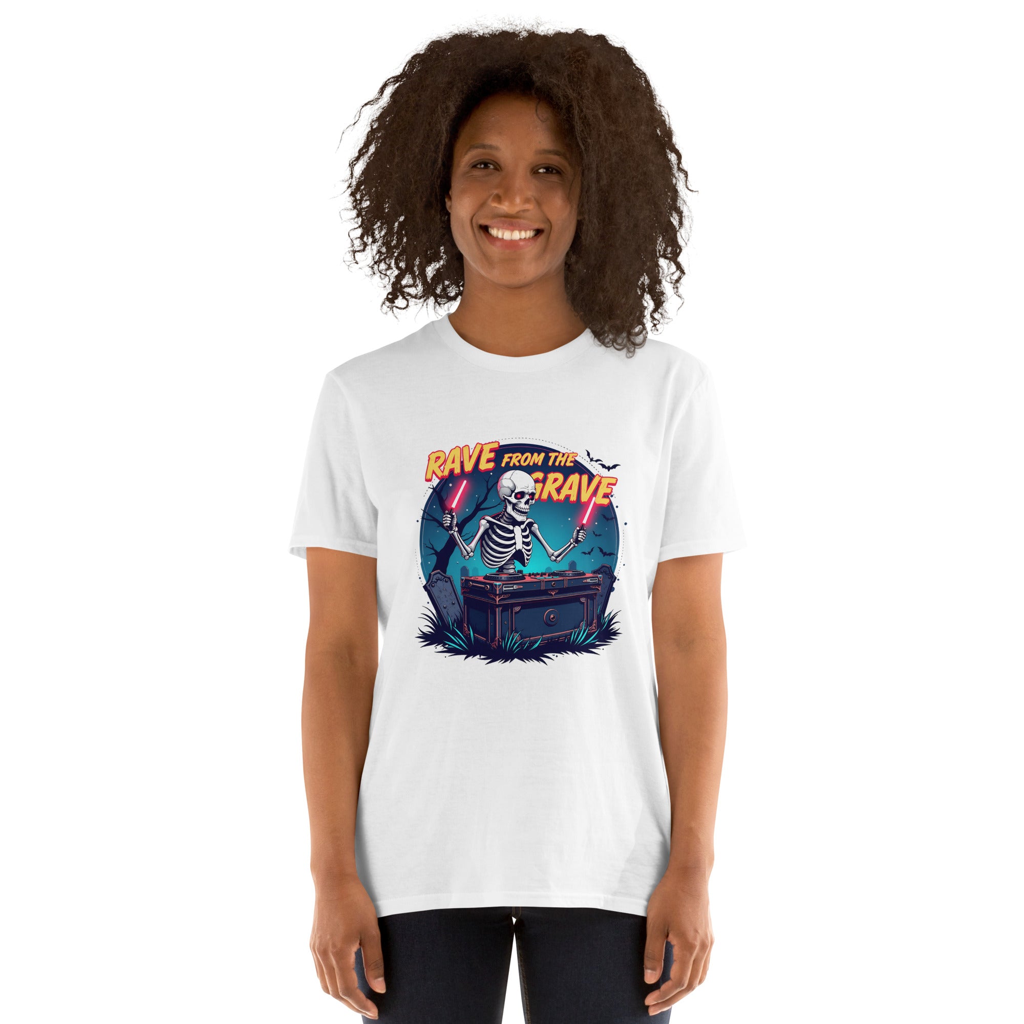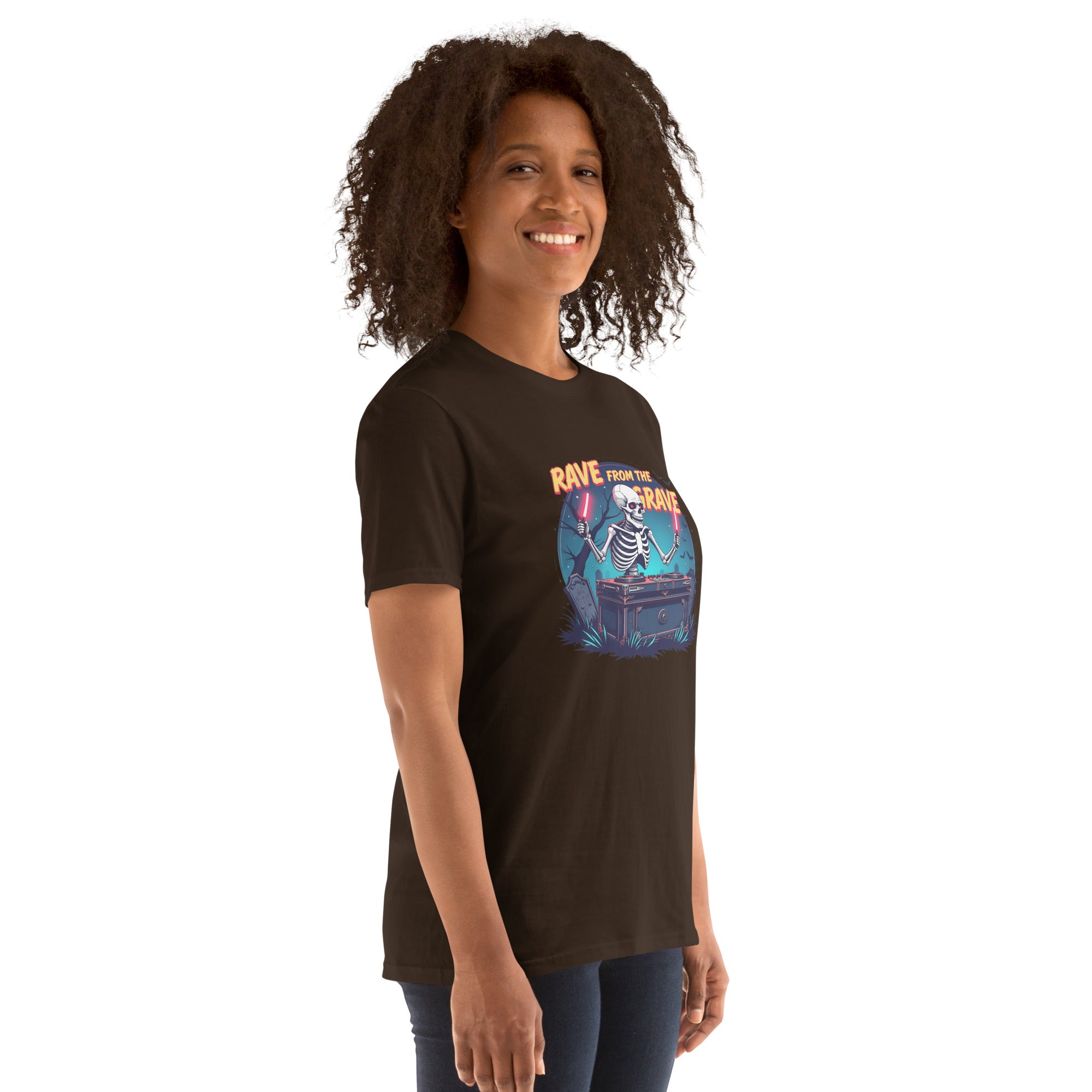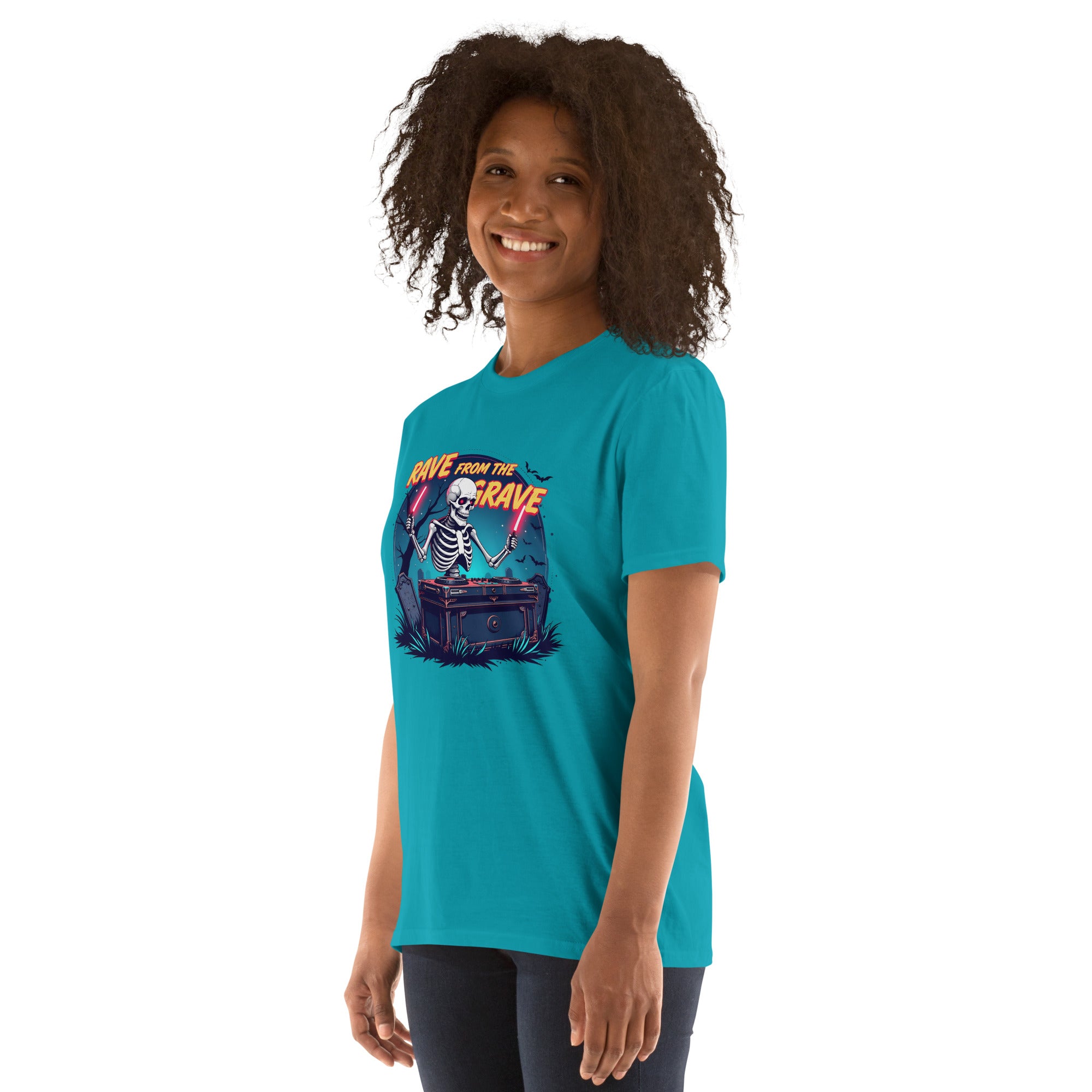 Who says the undead can't dance? This tee screams louder than a zombie DJ dropping a bassline in a crypt.