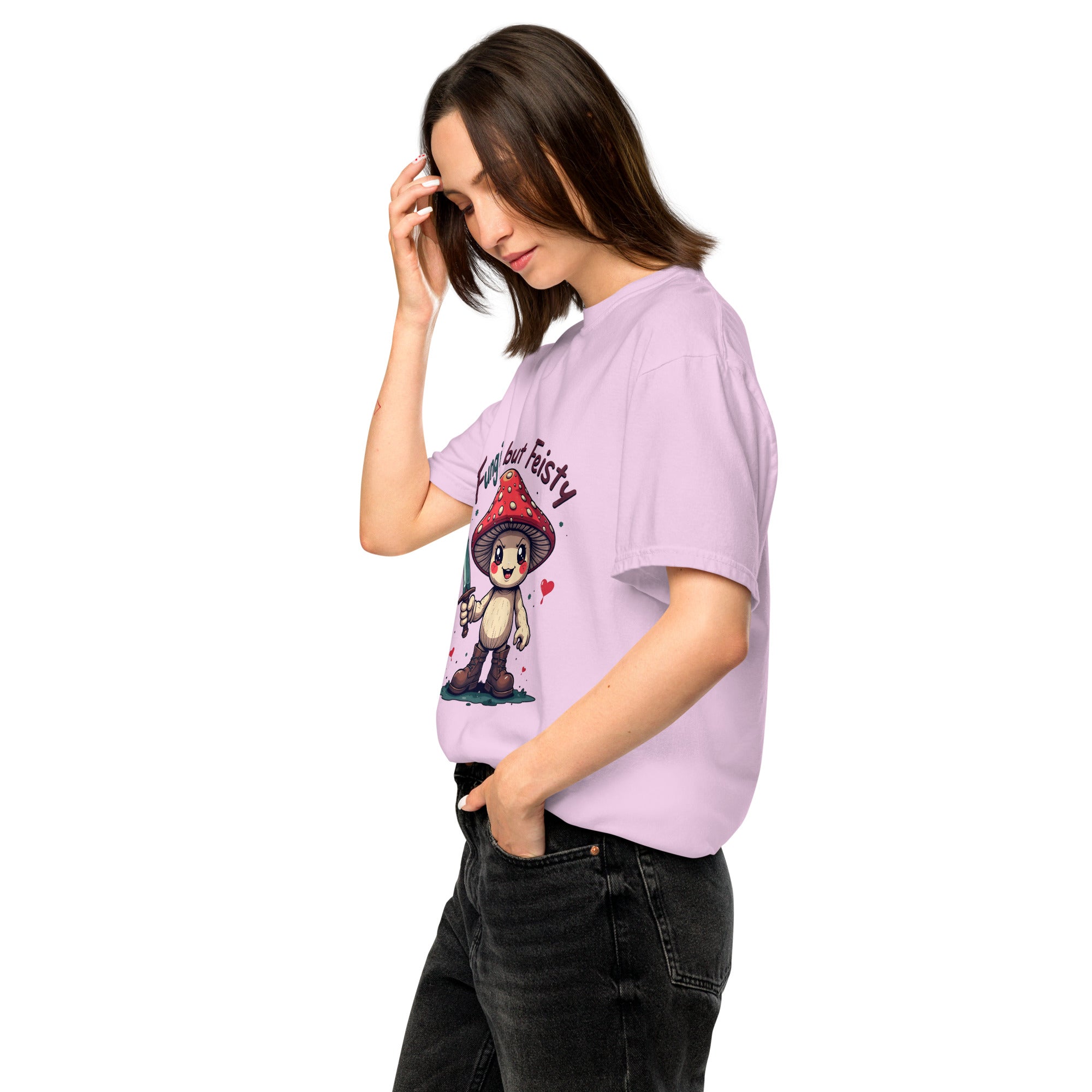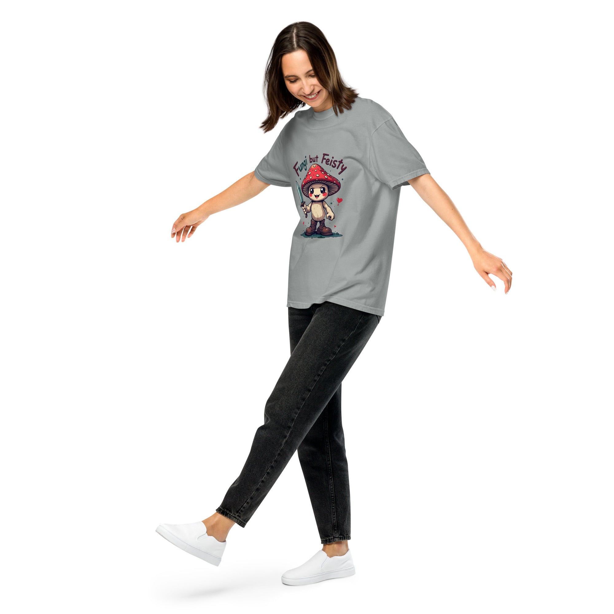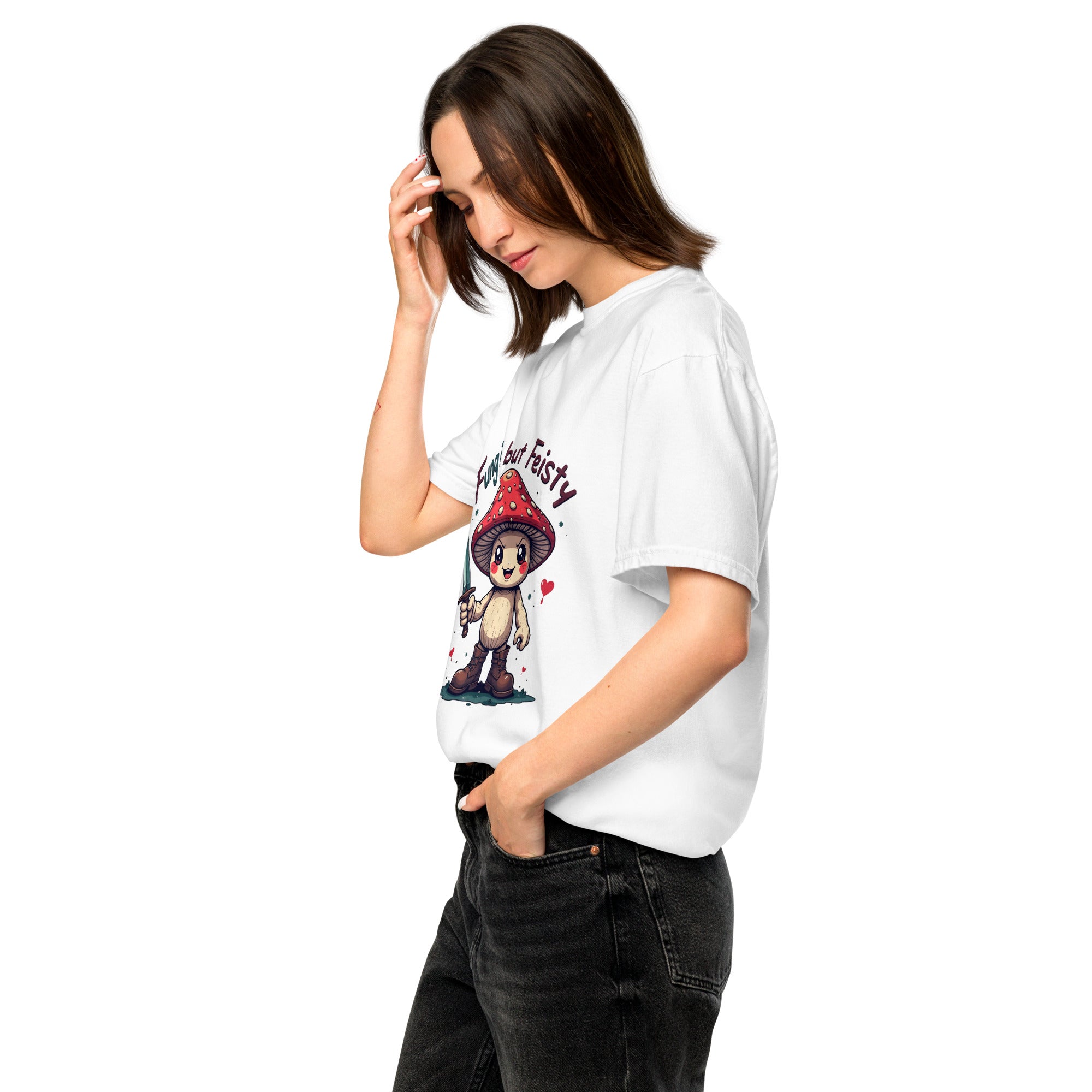 The "FUNGI AND FEISTY" T-shirt is for the wild-hearted, nature-loving souls who know that strength can grow in the most unexpected places — just like fungi. With a nod to earthy vibes and a wink of bold personality, this heavyweight tee is made for women who are grounded, unpredictable, and unapologetically themselves.