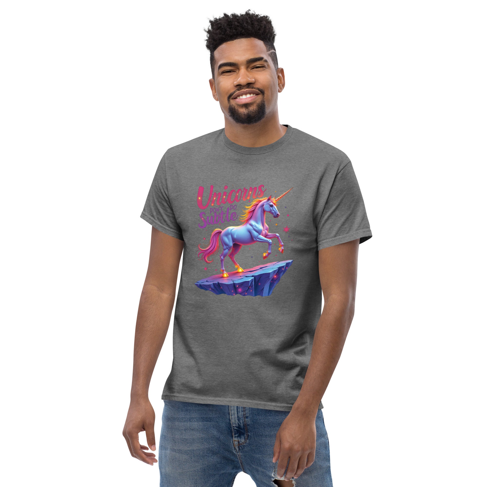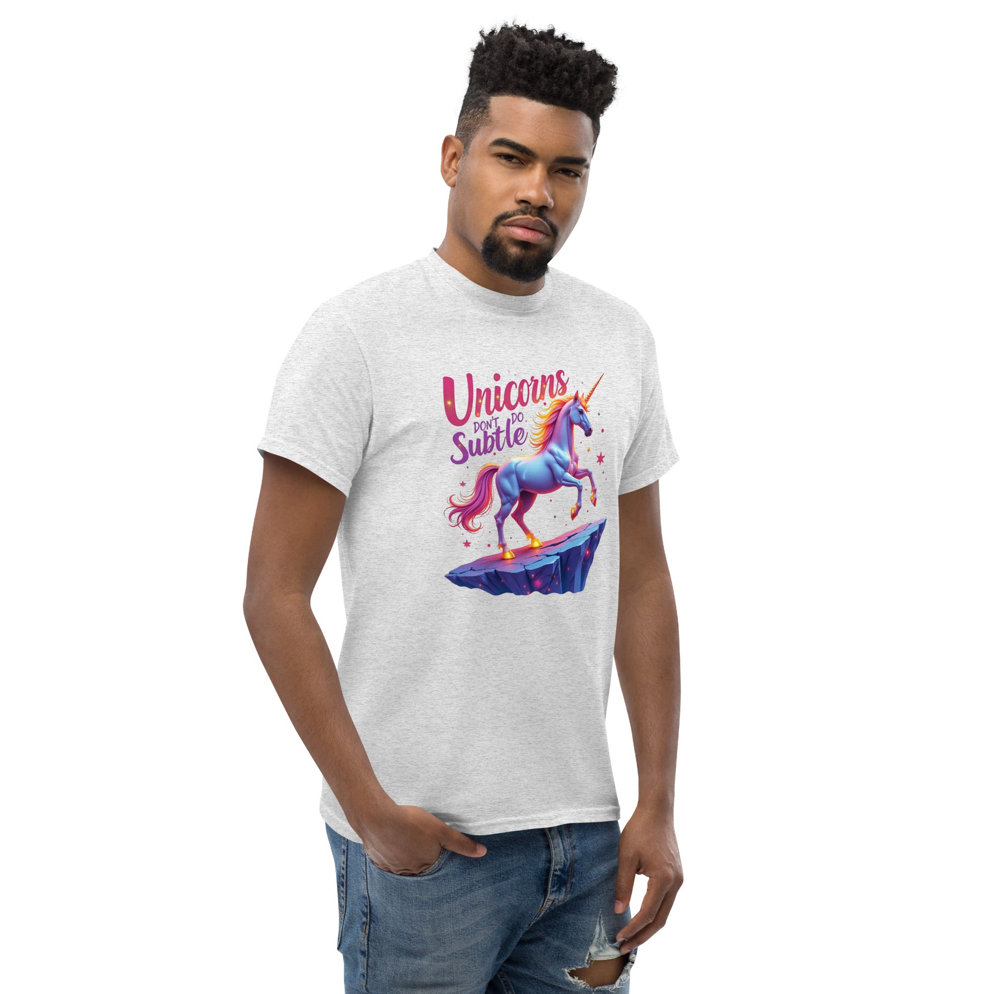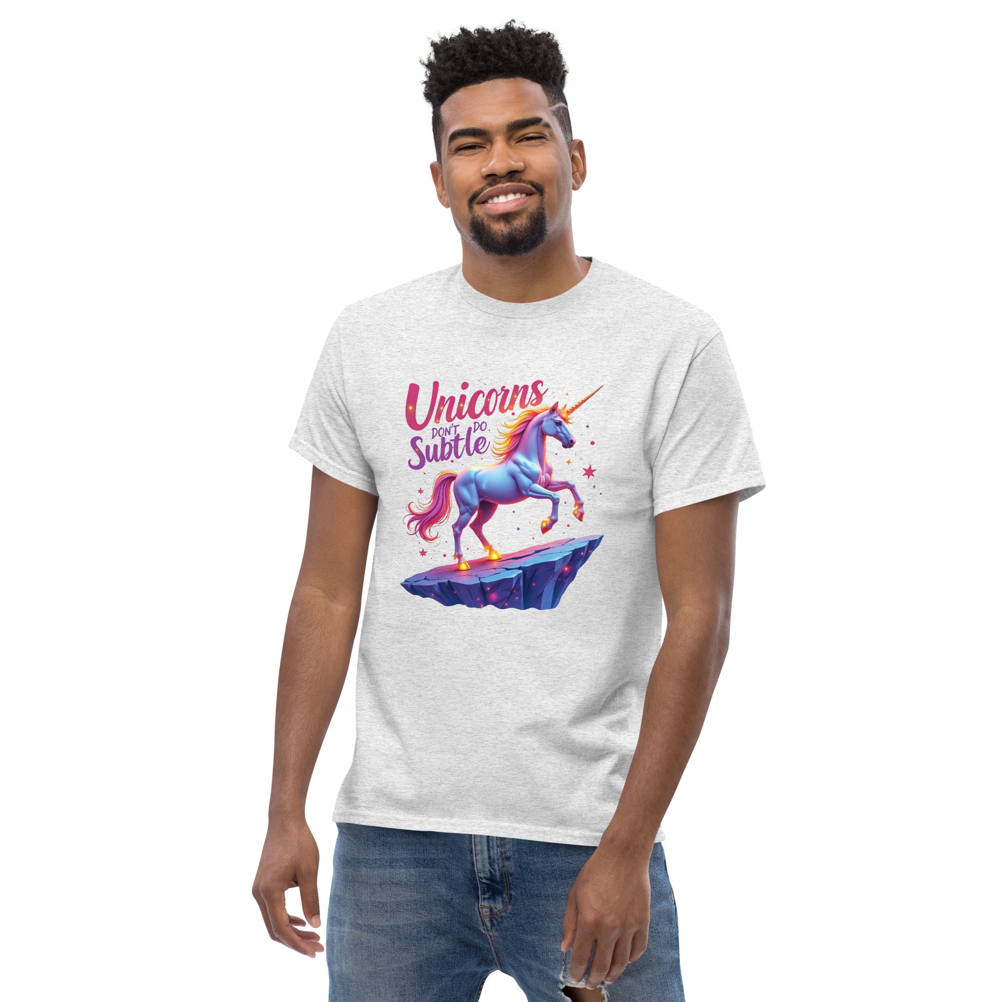 If you’re the kind of person who believes in making an entrance and living life boldly, the "UNICORNS DON'T DO SUBTLE" Men’s Classic Tee is your new favorite shirt. This tee isn't for the quiet, the reserved, or the shy. It’s for the ones who shine brightly, who make sure their presence is felt, and who know that subtlety is just a word for someone else.