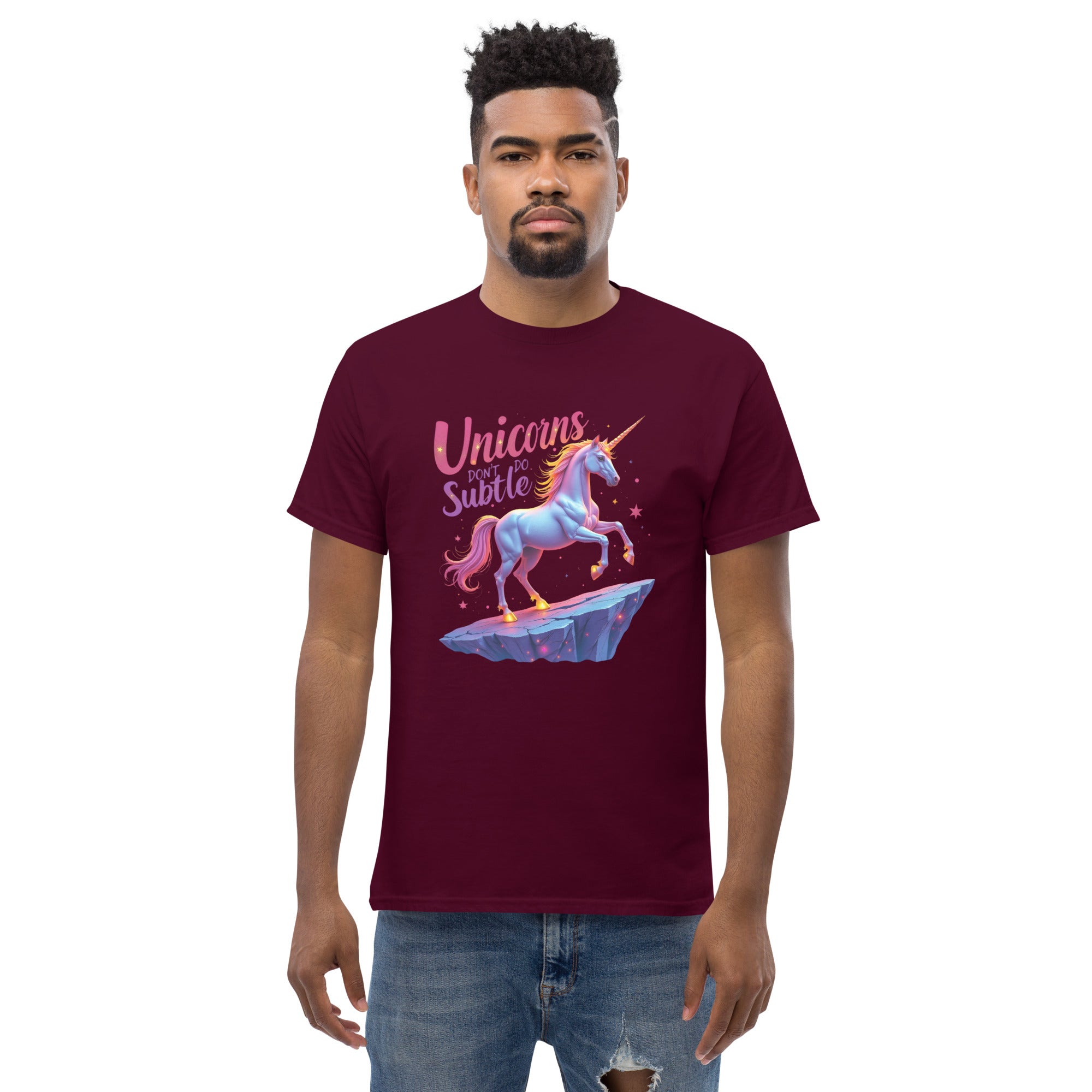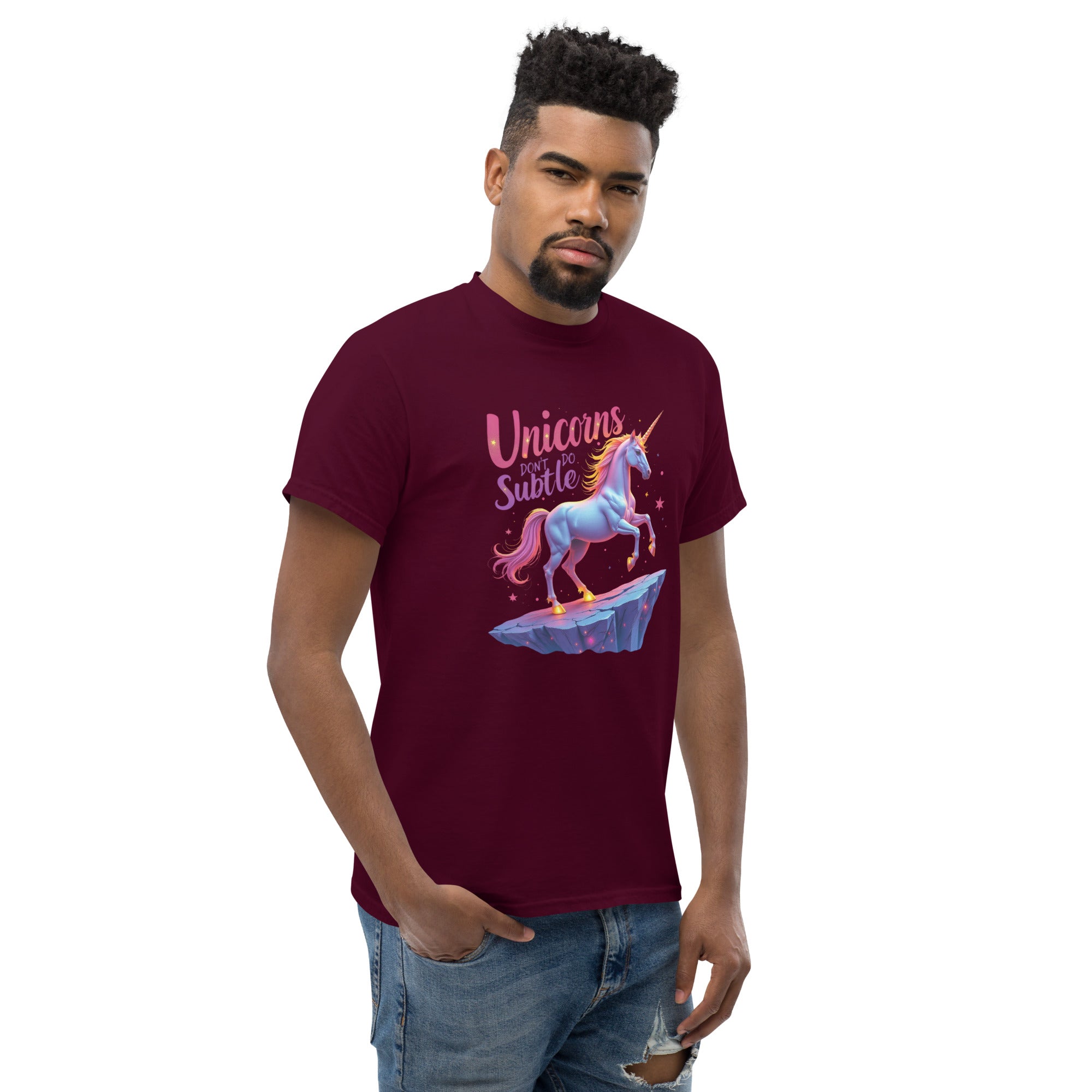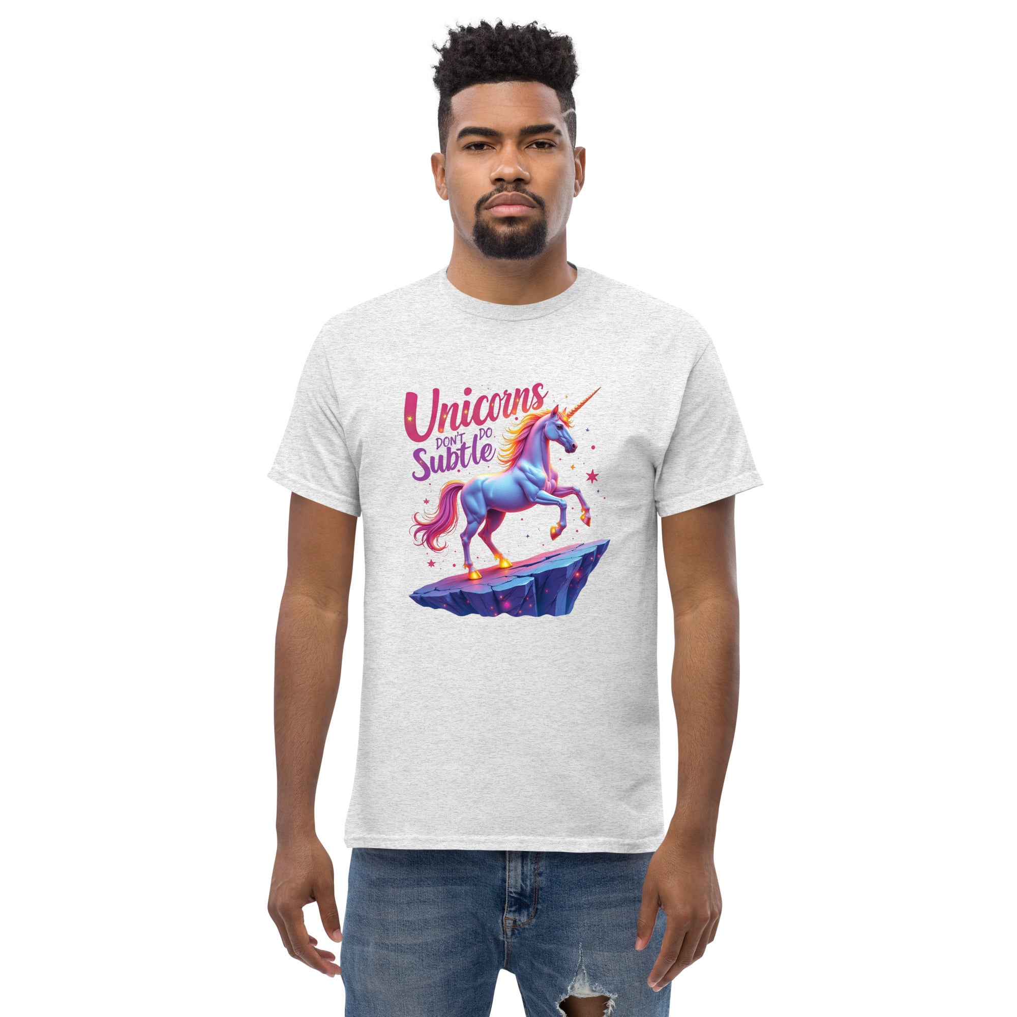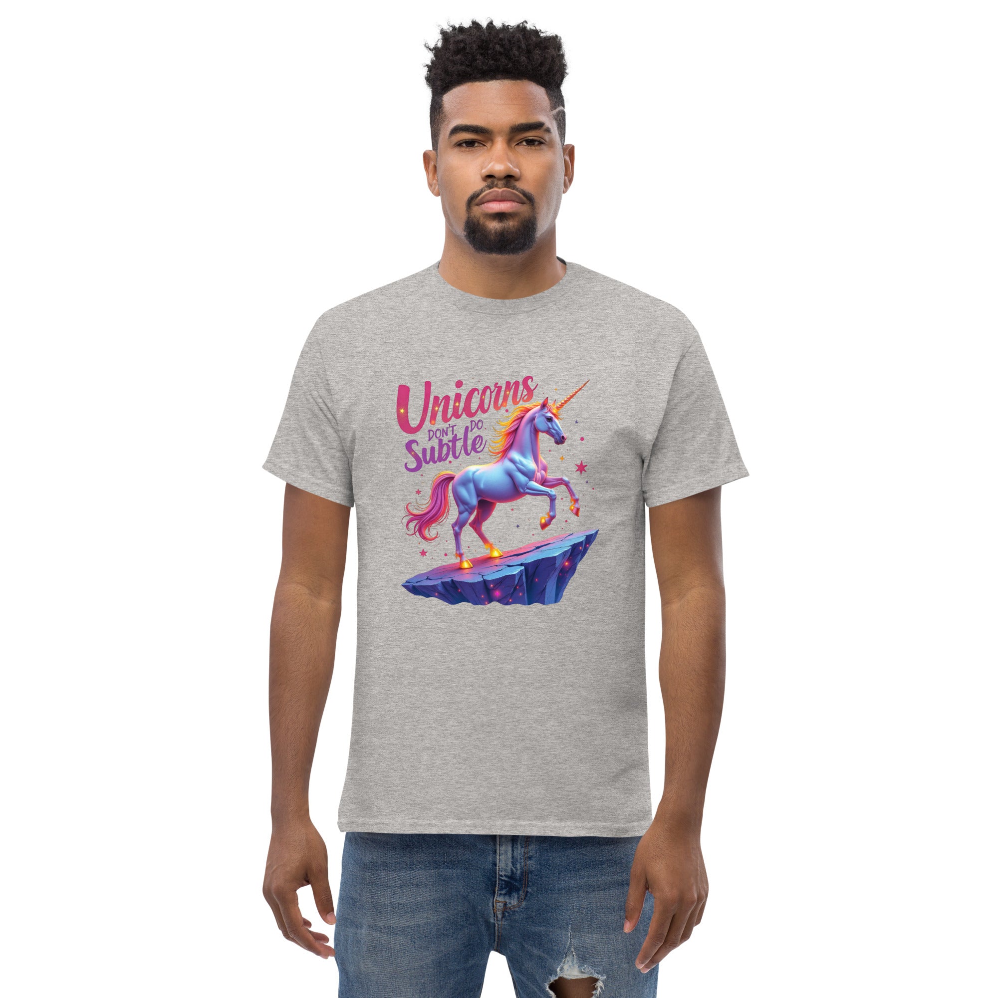 If you’re the kind of person who believes in making an entrance and living life boldly, the "UNICORNS DON'T DO SUBTLE" Men’s Classic Tee is your new favorite shirt. This tee isn't for the quiet, the reserved, or the shy. It’s for the ones who shine brightly, who make sure their presence is felt, and who know that subtlety is just a word for someone else.